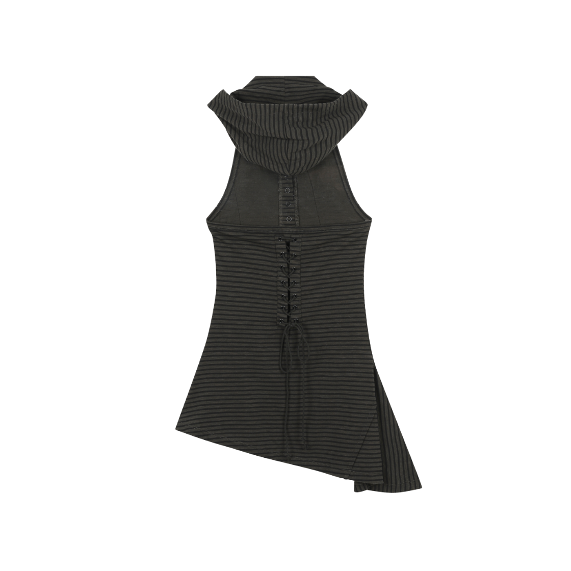 - 홀터넥 후드 디자인으로 슬림한 핏 - 언밸런스한 밑단 커팅으로 유니크한 실루엣 연출 - 플레어지는 밑단 처리 - 뒤판 스트링 디테일로 허리 사이즈 조절 가능