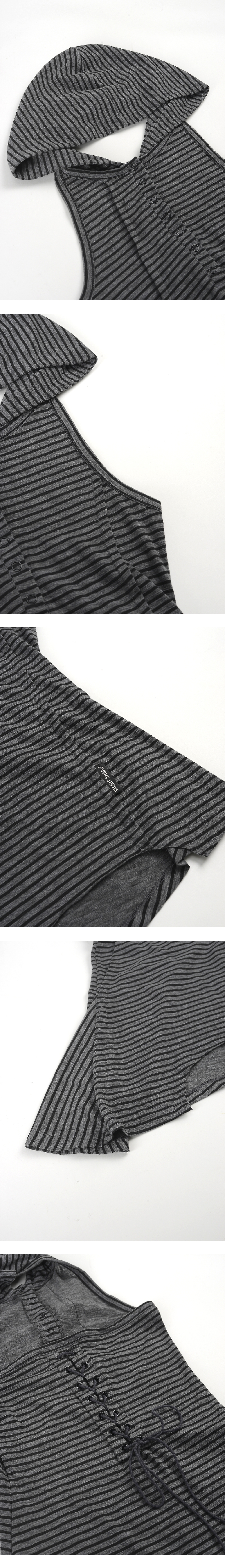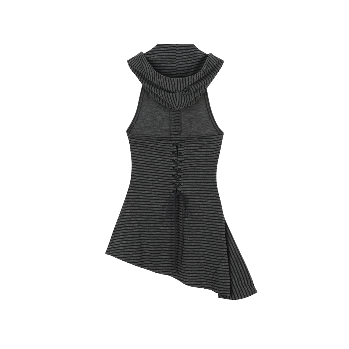 - 홀터넥 후드 디자인으로 슬림한 핏 - 언밸런스한 밑단 커팅으로 유니크한 실루엣 연출 - 플레어지는 밑단 처리 - 뒤판 스트링 디테일로 허리 사이즈 조절 가능