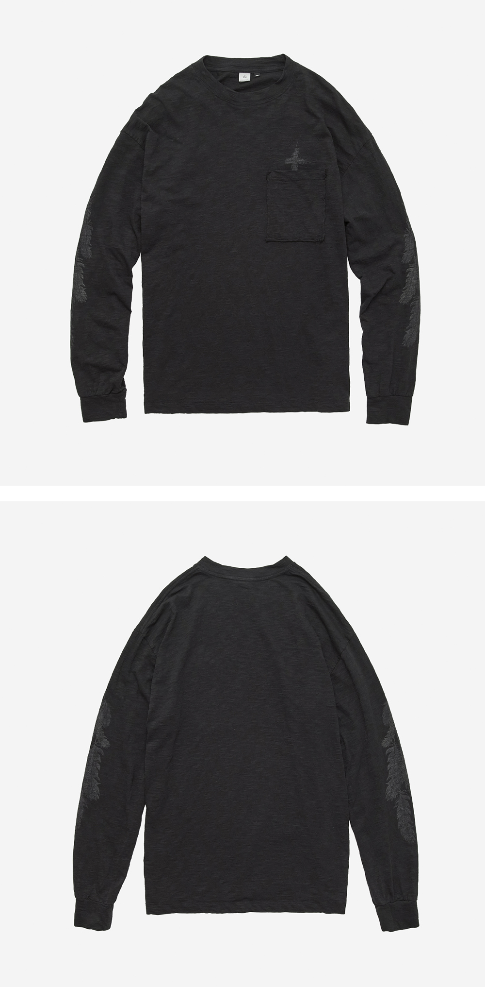 1011 feather long sleeve - 1011 페더 그래픽을 활용한 롱슬리브 - 로우컷으로 마감한 포켓 - 포켓 및 소매 페더 그래픽 프린팅 - 슬럽감 있는 원단 - 자연스럽고 편안한 착용감 - 단품 착용 및 레이어링 등 다양한 용도로 착용 가능 *모델: 170 후반 / 마른 체형, 3사이즈 착용 *직전 차수 대비, 금번 차수의 경우 - 유사한 컬러감으로 제작되었으며, 페더 프린팅을 보다 선명하게 완성했습니다. - 미세하게 소매, 기장 치수감 조정하여, 약 2cm 작게 완성했습니다.