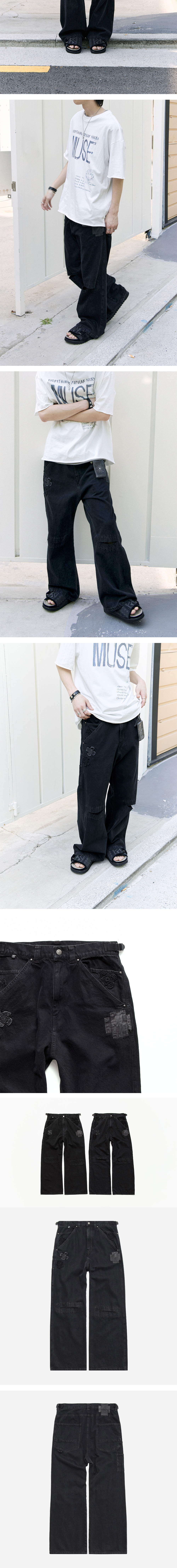 1011 cross patched denim pants (cut off knee) - black - 전면 입체감 있는 플라워 크로셰 패치 - 전/후면 카모 프린팅된 크로스 탭 패치 - 무릎 부분 컷오프 디테일 - 가먼트 째로 다잉 및 워싱 - 우측 허벅지 사이드 포켓 - 웨이스트 우측의 지갑 & 키링 연결 가능한 고리 - 웨이스트 어드저스트 *모델: 170 중반 / 마른 체형, 3사이즈 착용 *디자인 의도에 맞게 착용하시려면 기존 폴리테루 제품과 동일한 사이즈를 선택하시는 것을 권장드립니다. *일반 체형 기준 - 170cm 초반 이하 2사이즈 권장 - 170cm 중반 3사이즈 권장 - 170cm 후반~180cm 초반 4사이즈 권장