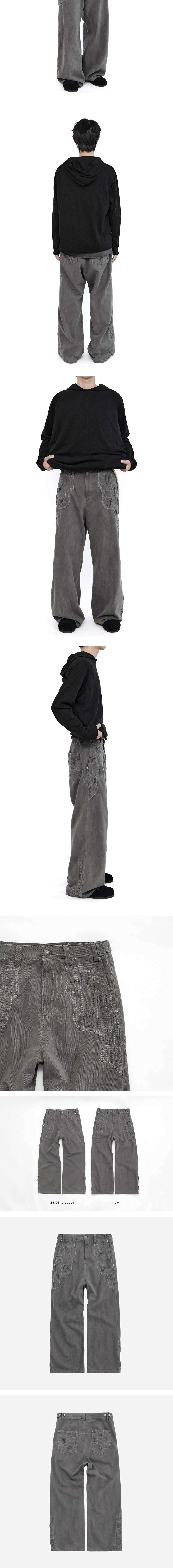1011 western boro pants - gray - 카펜터 팬츠 기반의 디자인 - 보로 데미지 및 누빔 스티치 디테일 - 퍼티그 포켓 - 웨스턴 절개 라인 - 카모 패턴의 포켓 안감 - 가먼트 째로 피그먼트 다잉 및 워싱 *모델: 170 중반 / 마른 체형, 3사이즈 착용 *디자인 의도에 맞게 착용하시려면 기존 폴리테루 제품과 동일한 사이즈를 선택하시는 것을 권장드립니다. *일반 체형 기준 - 170cm 초반 이하 2사이즈 권장 - 170cm 중반 3사이즈 권장 - 170cm 후반~180cm 초반 4사이즈 권장 *금번 차수는 직전 차수 대비 채도가 낮고 어둡게 완성됐습니다.