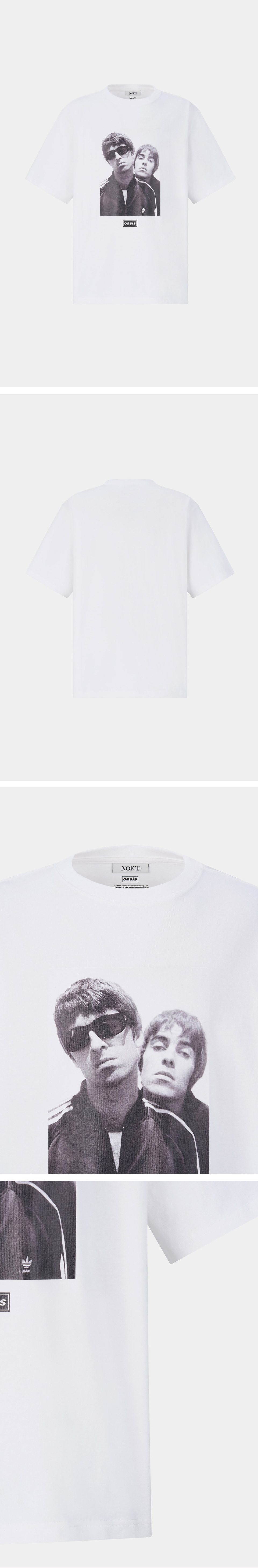 NOICE X OASIS 리암&노엘 티셔츠입니다. 리암과 노엘 갤러거의 시그니처 흑백 포트레이트 이미지를 전면에 담은 디자인입니다.
