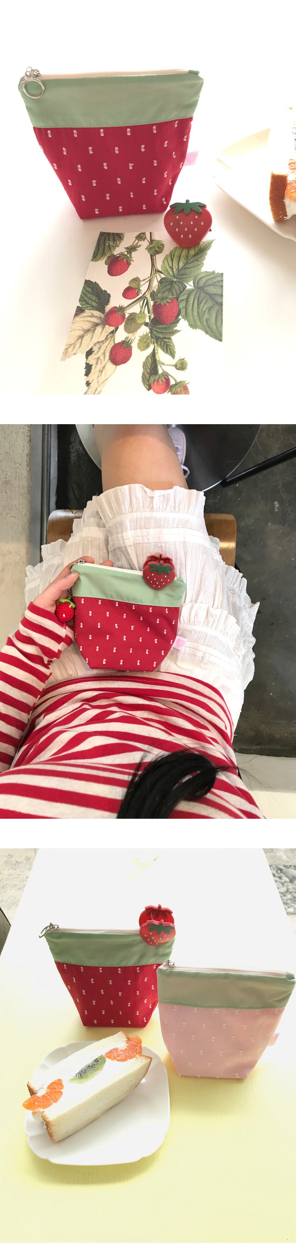 귀여운 딸기 모양을 모티브로 제작하였습니다. 바닥면이 있는 파우치로, 간단한 소지품을 수납하기 유용합니다.