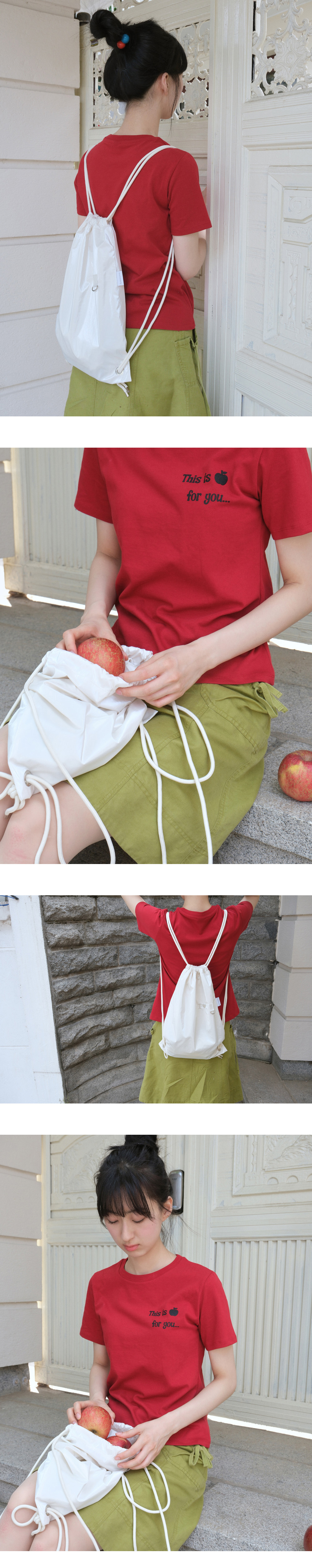 아이썸머리의 걸 스트링백 화이트는 반짝이는 유광 원단으로 제작되었습니다. 겉 원단이 방수가 된다는 장점이 있어요. 가방의 겉면에 수놓아진 아이 러브 ( I♥ ) 내가 사랑하는 것들을 넣으라는 뜻을 담고 있습니다. 키링 고리를 활용하여 사랑을 표현해 보세요!