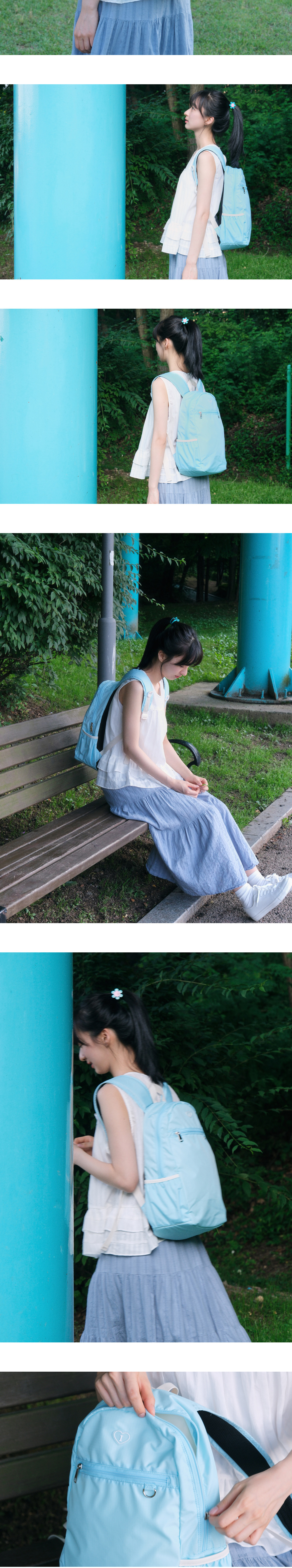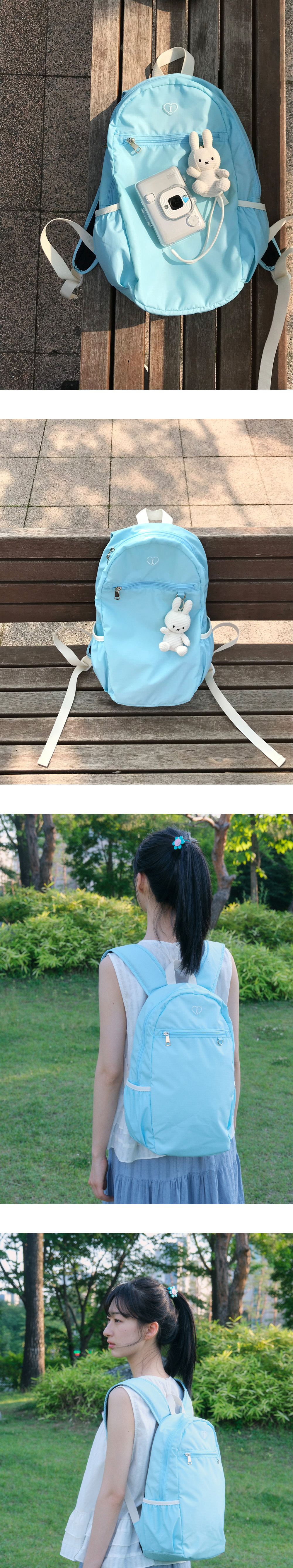 러브 워크 백팩! 언제나 발걸음에 사랑이 가득할 수 있도록 ♥ 투박함을 덜어내고 부드러운 곡선 쉐입으로 디자인을 완성했습니다. 두꺼운 어깨끈이 안정감 있는 착용감을 제공하며, 15인치 노트북까지 수납 가능한 넉넉한 공간을 갖추었습니다. 내부 포켓의 밴드 디테일로 깔끔하고 효율적인 수납이 가능합니다. 아이썸머리 시그니처 로고 라벨을 부착하여 사랑스러운 느낌을 주었습니다. 백팩의 앞면에 키링고리가 있어 나만의 가방 꾸미기를 하기 좋습니다. 내부 바닥에 보강재를 사용하여 수납 시 가방 처짐을 최소화했습니다.