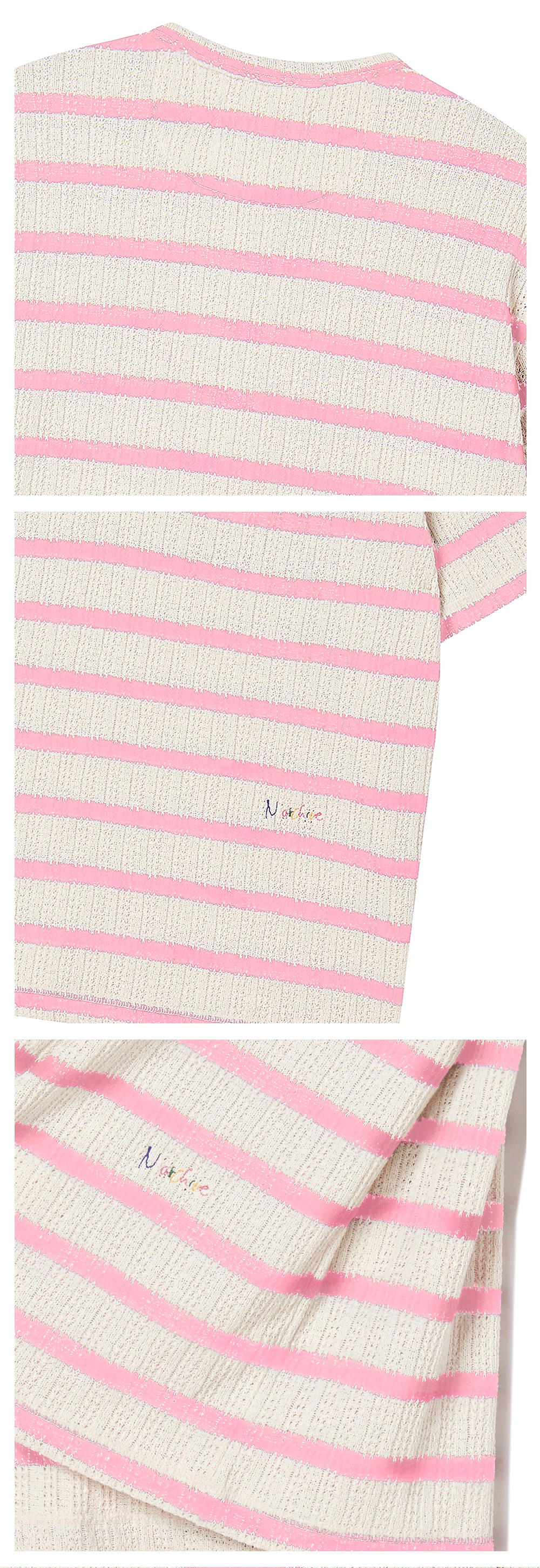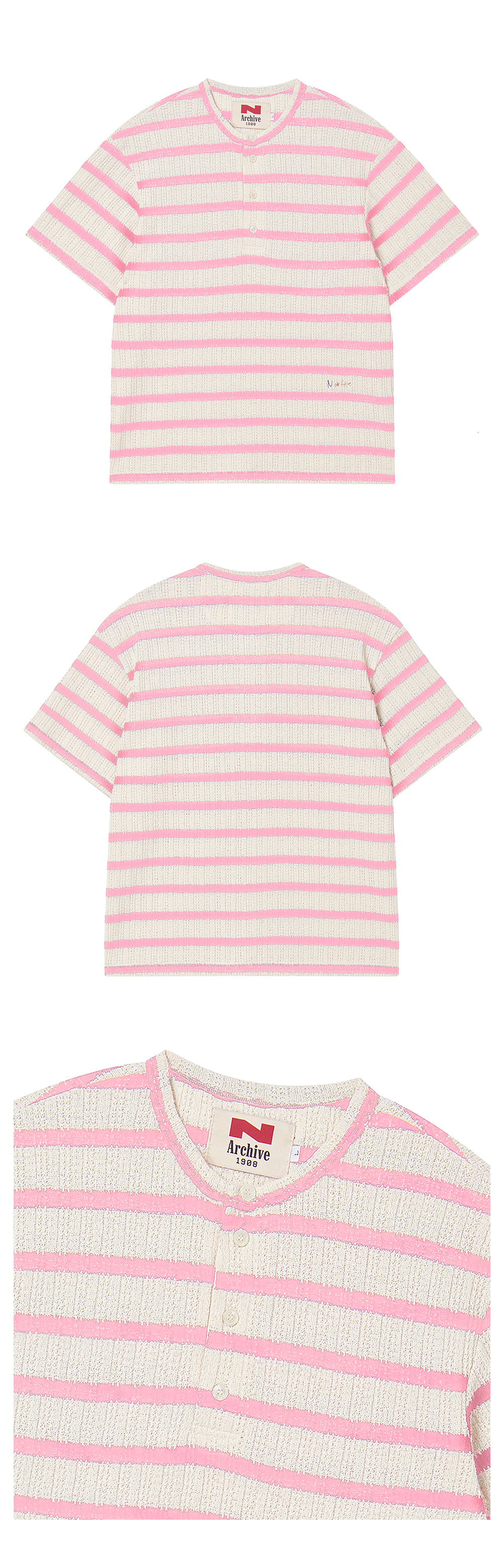엔 아카이브 럭스 코튼 스트라이프 헨리넥 반팔 니트 핑크
