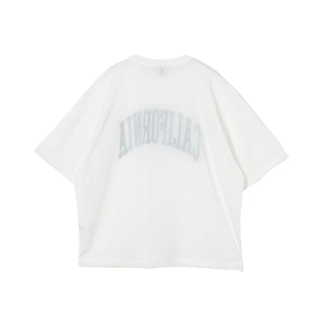 레이어드로 다양하게 활용 가능한 캘리포니아 제너럴 스토어 아일렛 메쉬 크루 넥 티셔츠 화이트입니다. - 중앙에 CALIFORNIA 로고 프린트 - 메쉬 소재 - 오버사이즈 실루엣