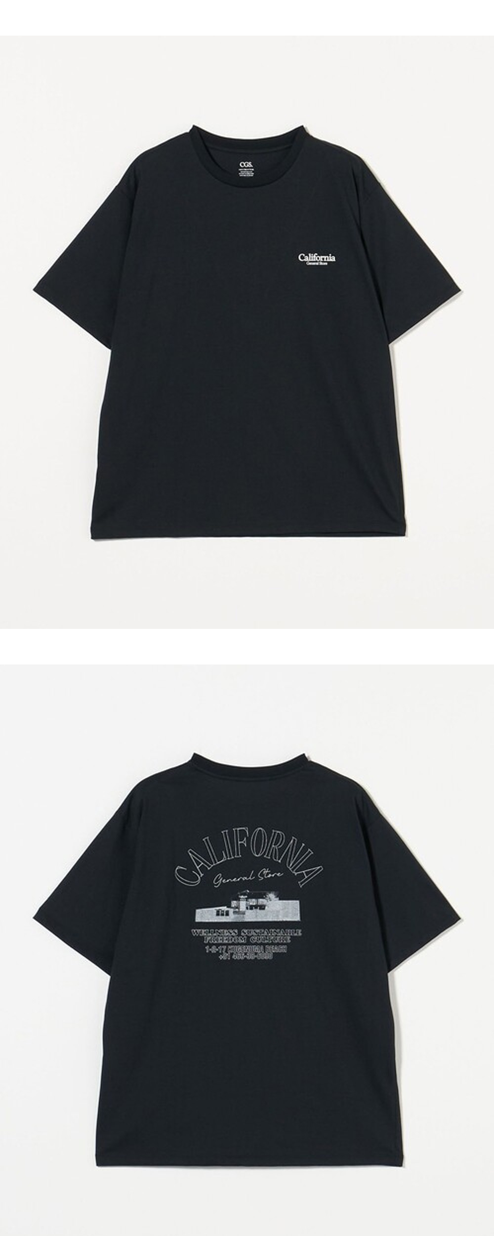 프린팅이 매력적인 캘리포니아 제너럴 스토어 수베니어 랙 티셔츠 블랙입니다. - 재활용 폴리 소재 - 왼쪽 가슴에 CGS 로고 - 뒷면에 구마누마 해변의 외관을 그래픽으로 프린팅