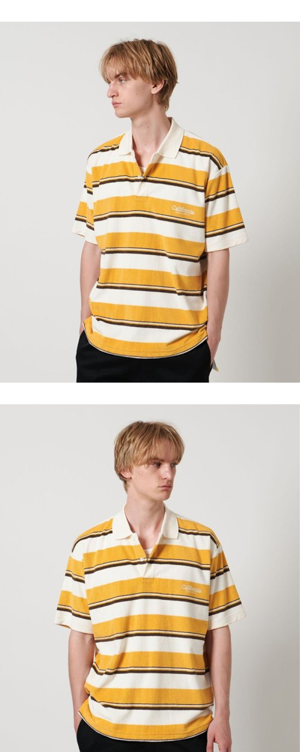 스트라이프 패턴이 매력적인 캘리포니아 제너럴 스토어 오가닉 코튼 파일 보더 폴로 셔츠 오렌지입니다. - 오버한 실루엣 - 유니섹스 - 왼쪽 가슴에 샵 로고 자수