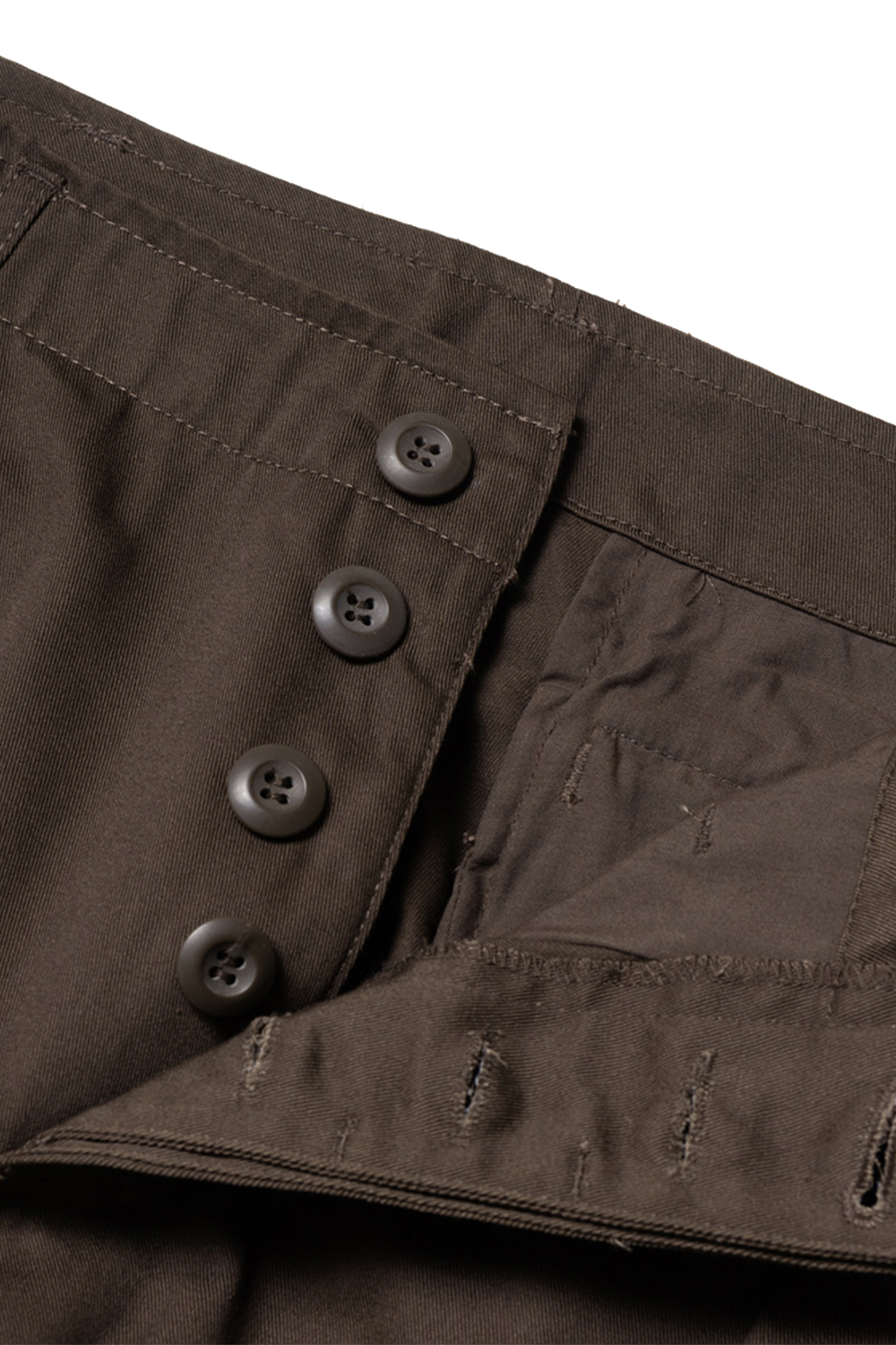 YMCL KY BDU Pants - Brown 'BDU'는 'Battle Dress Uniform' 약어입니다. 1960년대 초반 트로피칼 퍼티그 팬츠의 영향을 받은, EDRL 팬츠를 1980년대 채용 한 컴뱃 팬츠입니다. 밑위의 실루엣이 넉넉하며, 허벅지 부터 밑단까지 슬림하게 제작 되었습니다. 프론트는 버튼 플라이로 구성되어 있으며, 허리는 사이즈 어드저스터로 2-3cm 가량 작게 조절 가능합니다. 밑단 역시 스트랩이 있어서, 팬츠의 실루엣을 다양하게 조절 가능하며, 카코를 포함한 6포켓입니다. 착용시 'S'가 '30-32', 'M'이 '33-34' 'L'가 '35'입니다. * Polyester 65% / Cotton 35 % * YMCL KY 는 합리적인 가격으로 제품을 제공하기 위하여 별도의 포장이 존재하지 않습니다. * 빛에 의한 제품의 색감 차이가 존재 할 수 있습니다. * Made in China