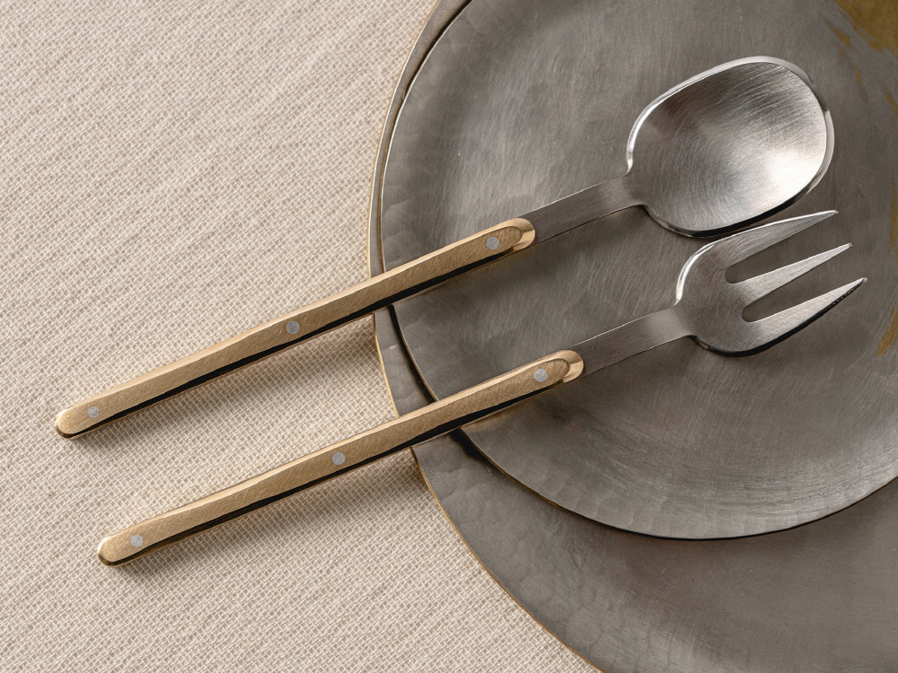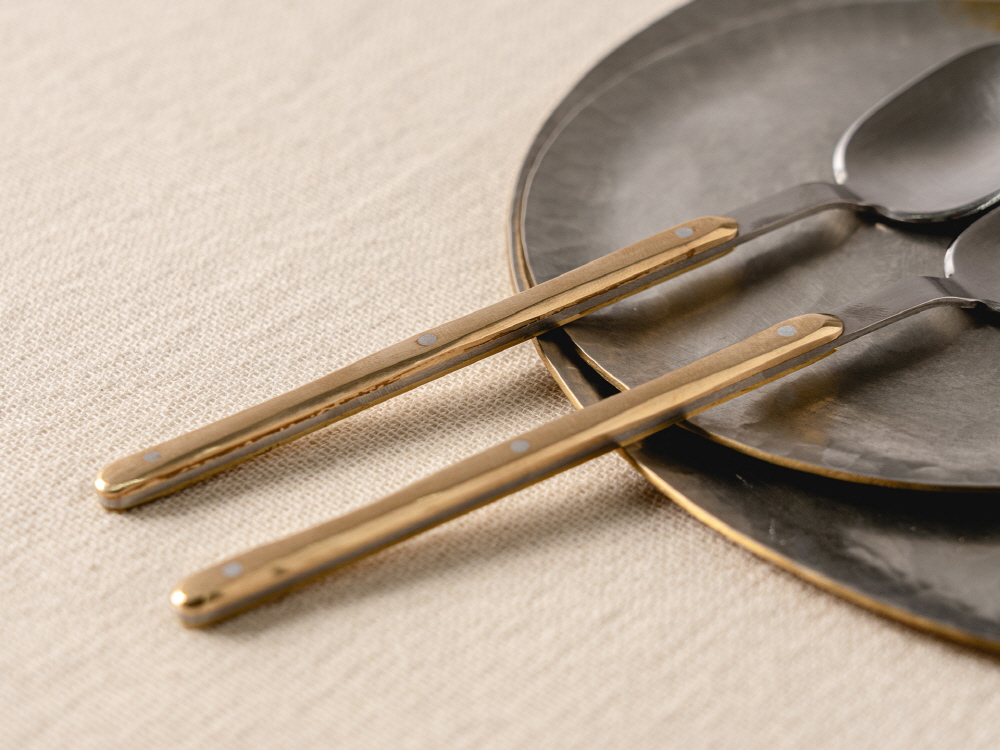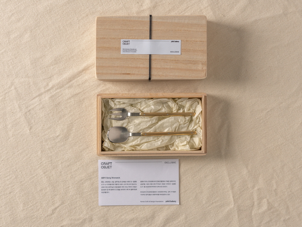 크기 숟가락 - 3 x 15.2 cm, 포크 : 2.2 x 14.8 cm 제작방식 Hand made 소재 Stainless steel, Gold, aluminium 구성품 숟가락 1p, 포크 1p 황동, 스테인레스 스틸, 알루미늄 등 금속을 소재로 한 <달콤한 도구> 는 디저트를 위한 커틀러리 세트다. 조각 텍스쳐가 돋보이는 손잡이 부분, 알루미늄과 은을 활용한 리벳 구조는 미학적 디테일이 돋보임과 동시에 형태적 견고함을 보여주며 식탁 위 플레이팅에 포인트를 준다. 송원석 작가는 한국공예·디자인문화진흥원에서 주최한 공예디자인 상품개발 사업의 최종 선정 작가로서 새로운 디자인의 <달콤한 도구> 를 프린트베이커리에서 단독으로 선보인다. 한국공예·디자인문화진흥원과 프린트베이커리는 공예 작가들의 지속적인 창작 활동과 유통 확대를 위해 협업하고 있다.
