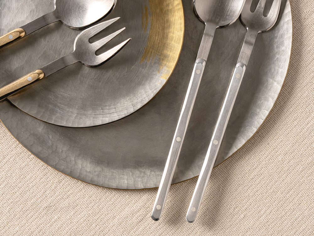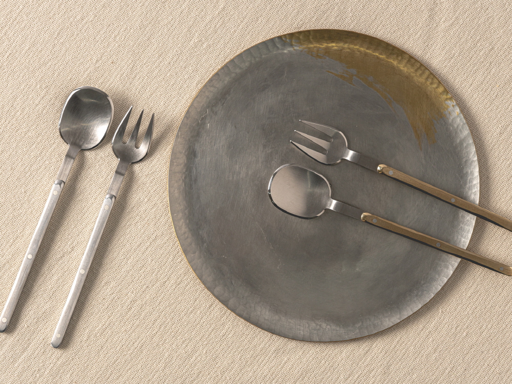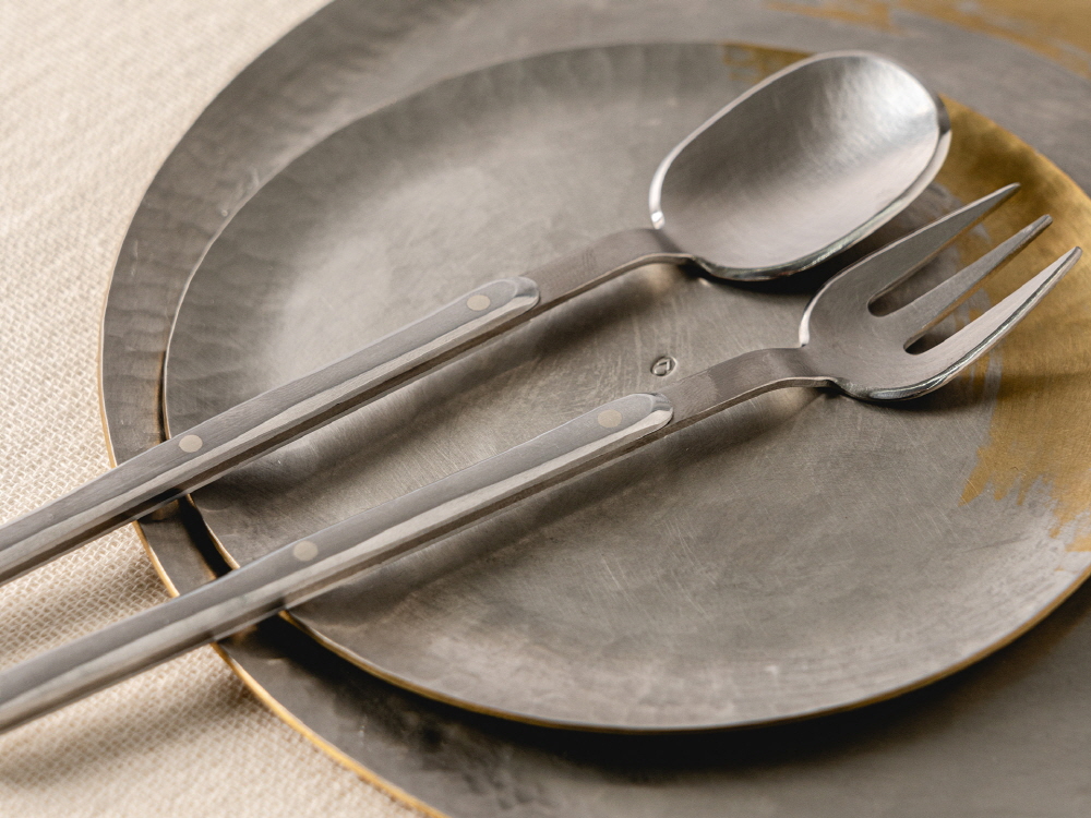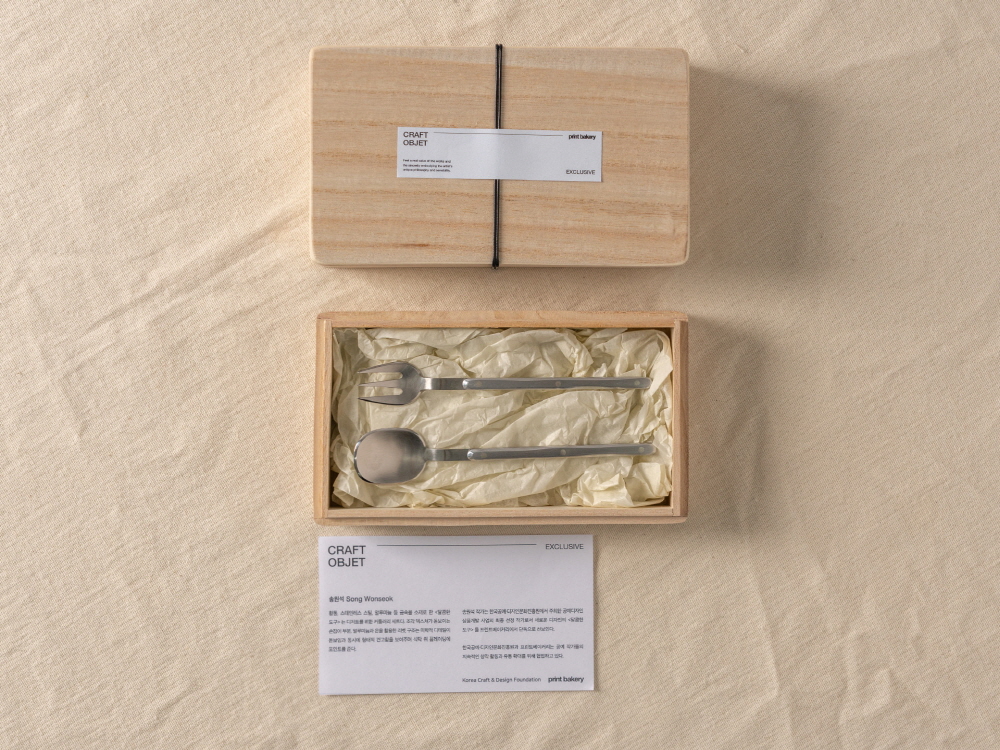 크기 숟가락 - 3 x 15.2 cm, 포크 : 2.2 x 14.8 cm 제작방식 Hand made 소재 Stainless steel, Silver, aluminium 구성품 숟가락 1p, 포크 1p 황동, 스테인레스 스틸, 알루미늄 등 금속을 소재로 한 <달콤한 도구> 는 디저트를 위한 커틀러리 세트다. 조각 텍스쳐가 돋보이는 손잡이 부분, 알루미늄과 은을 활용한 리벳 구조는 미학적 디테일이 돋보임과 동시에 형태적 견고함을 보여주며 식탁 위 플레이팅에 포인트를 준다. 송원석 작가는 한국공예·디자인문화진흥원에서 주최한 공예디자인 상품개발 사업의 최종 선정 작가로서 새로운 디자인의 <달콤한 도구> 를 프린트베이커리에서 단독으로 선보인다. 한국공예·디자인문화진흥원과 프린트베이커리는 공예 작가들의 지속적인 창작 활동과 유통 확대를 위해 협업하고 있다.