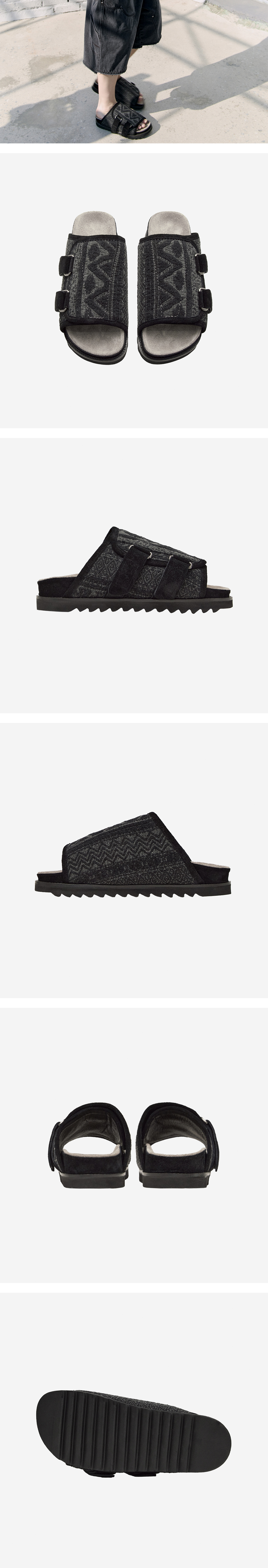 *본 제품은 예약주문 제품으로, 6/28(토) 15:00 ~ 7/1(화) 18:00까지 접수를 진행합니다. *주문 순서에 따라 발송까지 7~8주 소요됩니다. *8/13(수) ~ 8/18(월)까지 발송 예정 1011 ethnic jumbo slippers 1011 협업 컬렉션, 1011 갤러리와 협업으로 새롭게 해석한 점보 슬리퍼. 전면 패턴을 에스닉 패턴으로 디자인했으며, 워싱 가공하여 빈티지한 무드를 완성했습니다. 슬라이더 슈즈를 기반으로 더블 형태 덮개 형식으로 해석한 슬리퍼로, 사이드 벨크로 스트랩은 스웨이드 소재로 마감했습니다. *천연가죽 사용하는 제품으로, 제품에 맞춰 창을 갈아 만드는 공정 특성상 미세한 긁힘이나 찍힘이 있을 수 있습니다. *본 제품의 경우, 발등 플랩 조절을 통해 본연의 편안한 착화감으로 착용해주실 수 있습니다. 발등플랩(덮개)의 밸크로를 해제하여 전체 오픈하신 뒤, 발목 모양에 맞춰 덮개를 다시 닫아주시기 바랍니다. *모델: 170 후반 / 마른 체형, 3사이즈 착용
