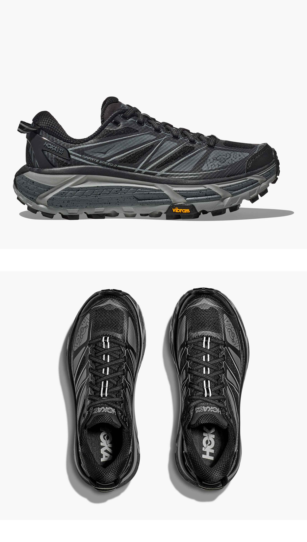 험한 지형, 장거리 러닝에 최적화된 테크니컬 러닝화, 호카 마파테 스피드 2입니다. - 가벼우면서도 안정적인 착화감 제공 - 뛰어난 접지력과 내구성 확보 - 경량 미드솔로 자연스러운 보행과 쿠셔닝 제공