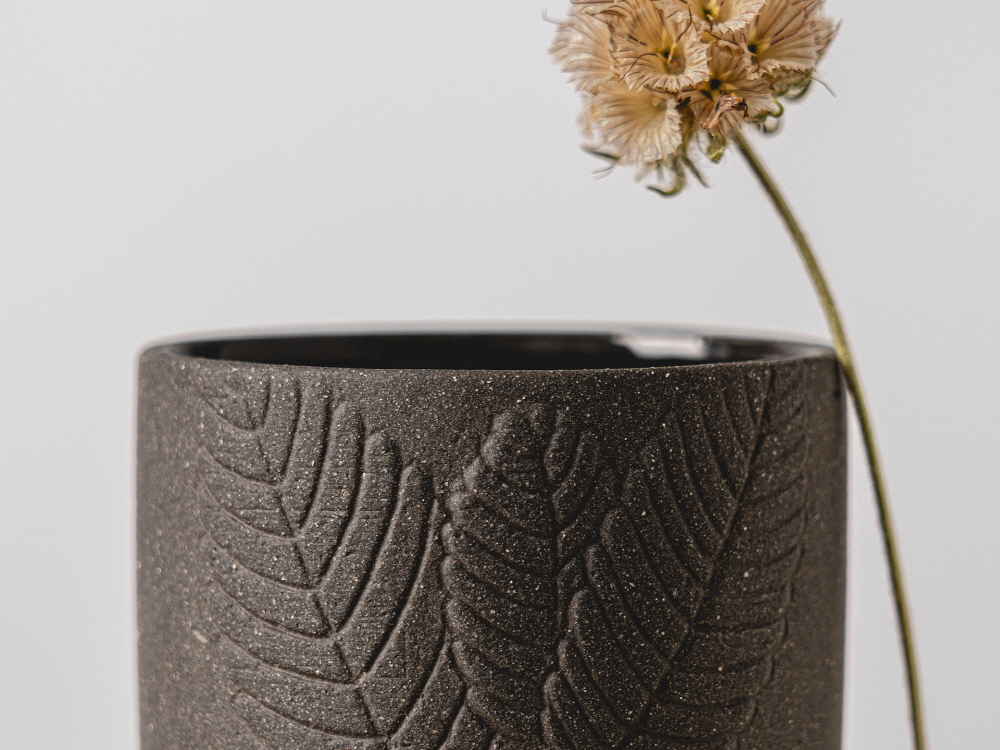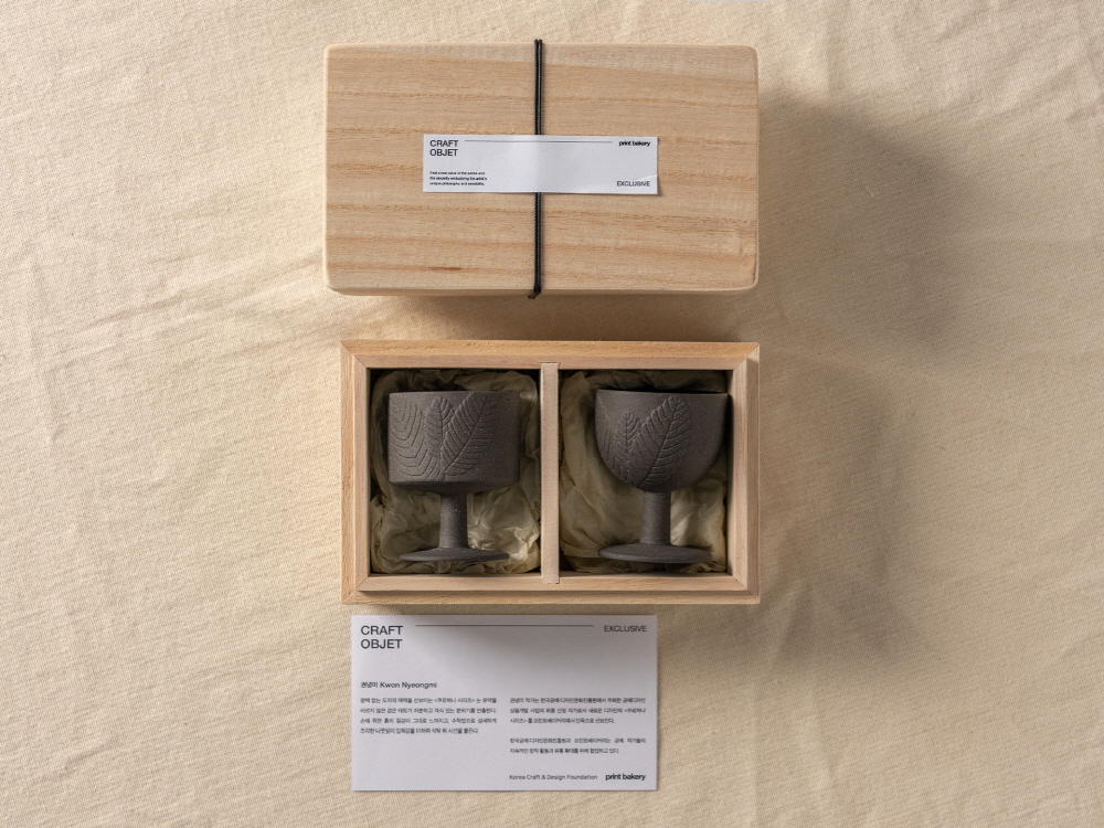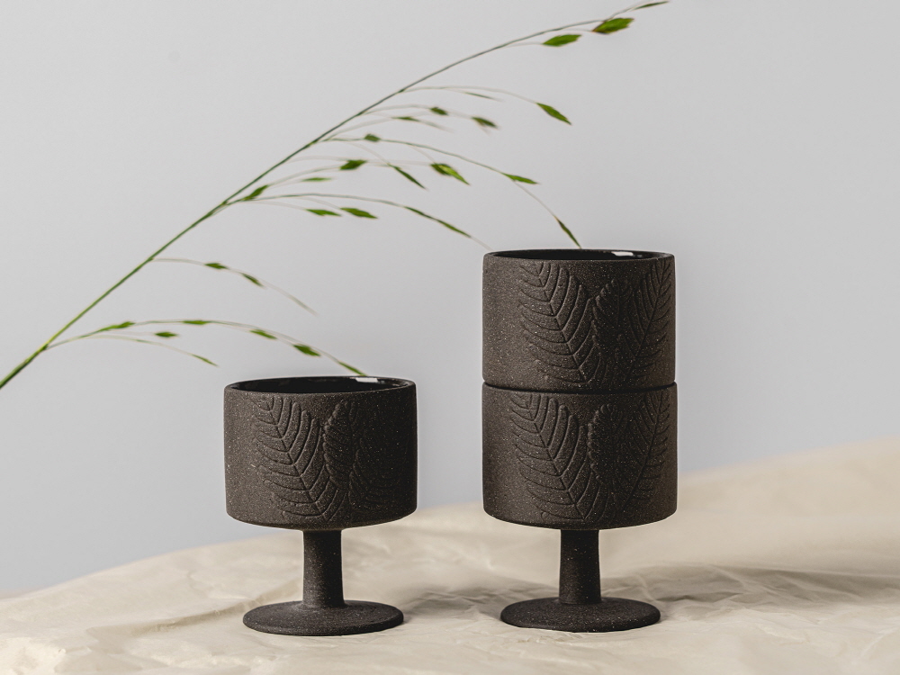 크기 5.5 x 5.5 x H 7 cm 제작방식 Hand made 소재 Ceramic 구성품 고블렛 잔 2p (1set) 광택 없는 도자의 매력을 선보이는 <쿠로하나 시리즈> 는 유약을 바르지 않은 검은 태토가 차분하고 격식 있는 분위기를 연출한다. 손에 쥐면 흙의 질감이 그대로 느껴지고, 수작업으로 섬세하게 조각한 나뭇잎이 입체감을 더하며 식탁 위 시선을 붙든다. 권녕미 작가는 한국공예·디자인문화진흥원에서 주최한 공예디자인 상품개발 사업의 최종 선정 작가로서 새로운 디자인의 <쿠로하나 시리즈> 를 프린트베이커리에서 단독으로 선보인다. 한국공예·디자인문화진흥원과 프린트베이커리는 공예 작가들의 지속적인 창작 활동과 유통 확대를 위해 협업하고 있다.