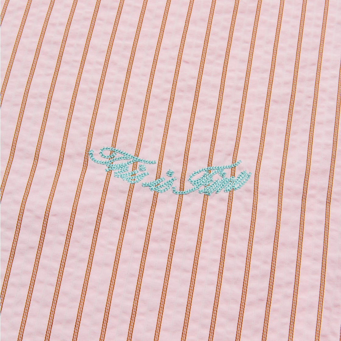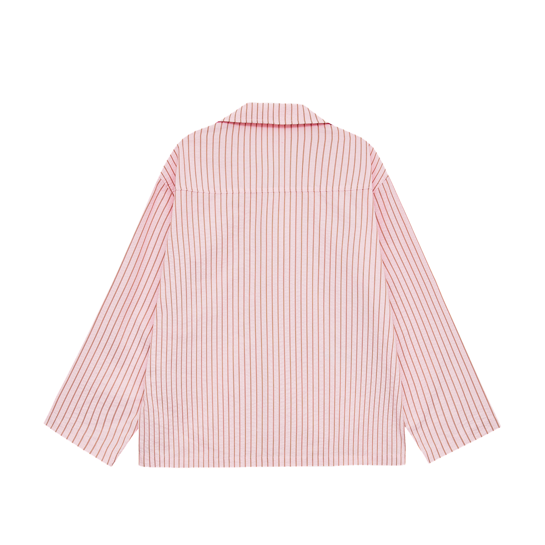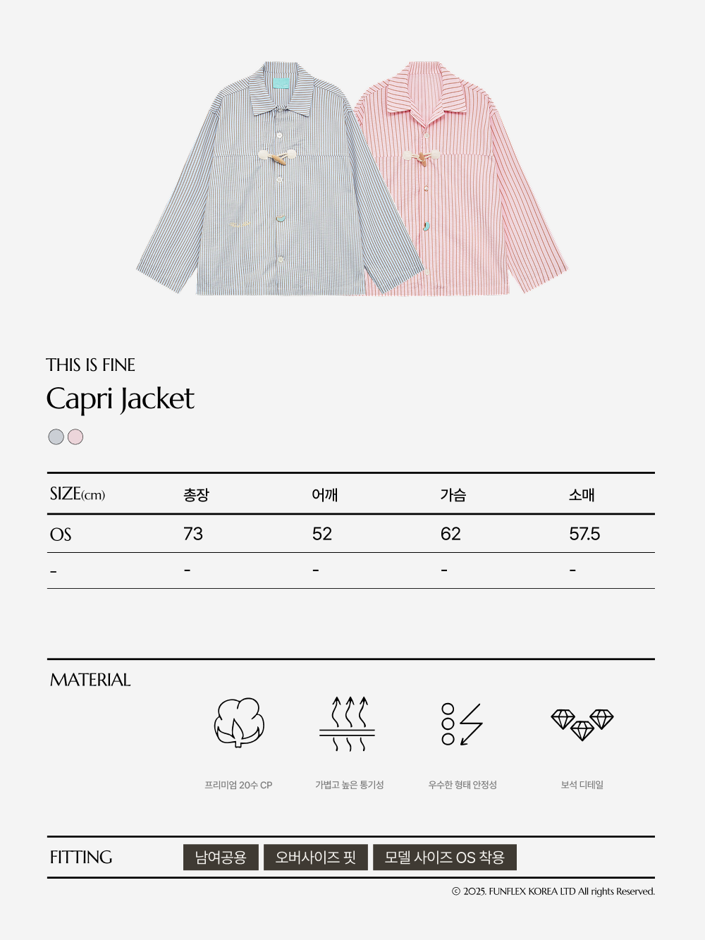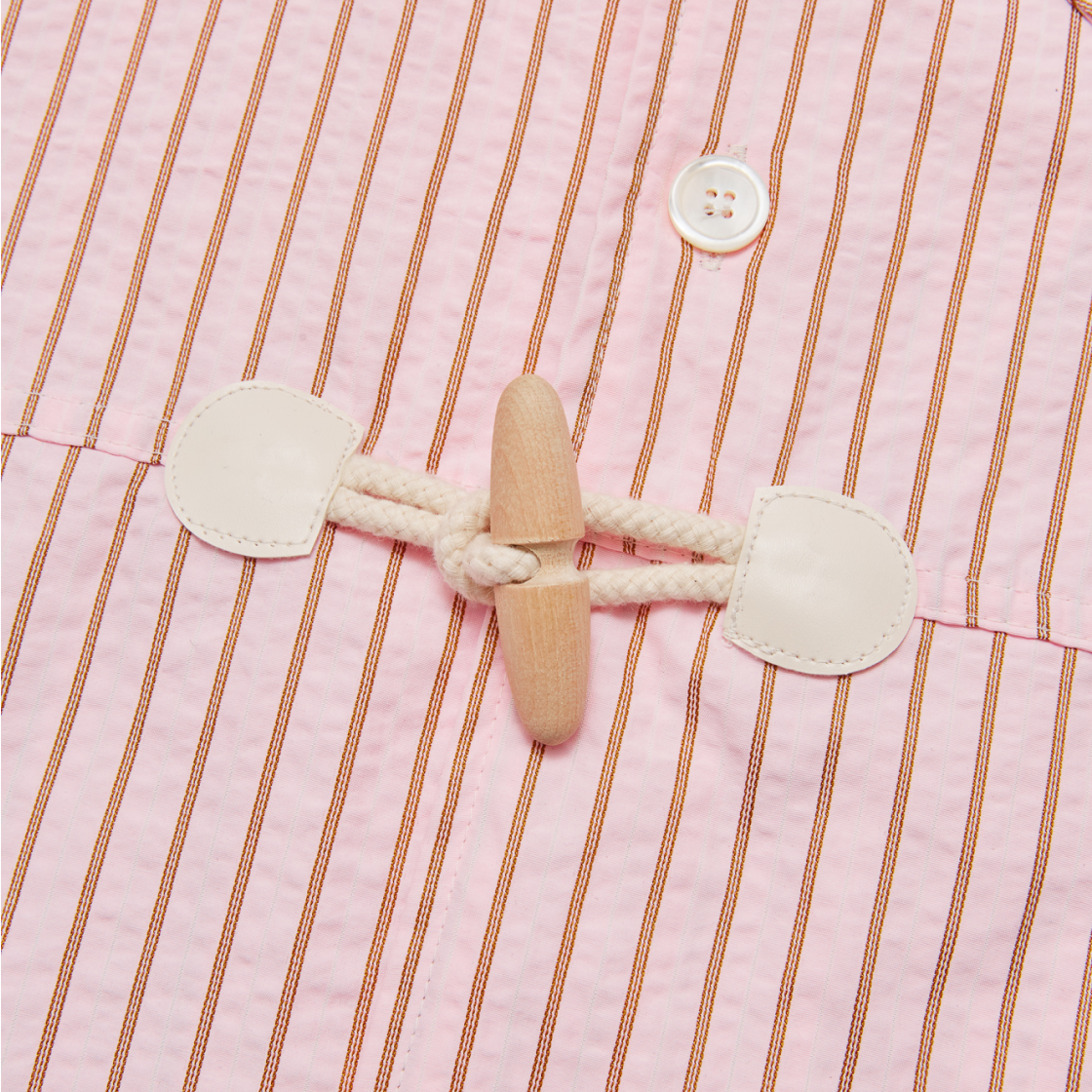햇살 따스한 휴양지의 오후, 파자마도 당신답게 입고 싶을 때. 고급스러운 디테일과 함께 준비했어요. ✓ 오버사이즈 핏, 남여공용 ✓ 20수 코튼 폴리 혼방으로 부드러우면서도 형태 유지성이 높은 원사 사용 ✓ 가볍고 통기성 좋은 스트라이프 원단 ✓ 리얼 자개 단추와 체인스티치 로고로 완성된 고급 디테일 ✓ 토글 장식으로 위트 있는 여밈 디테일