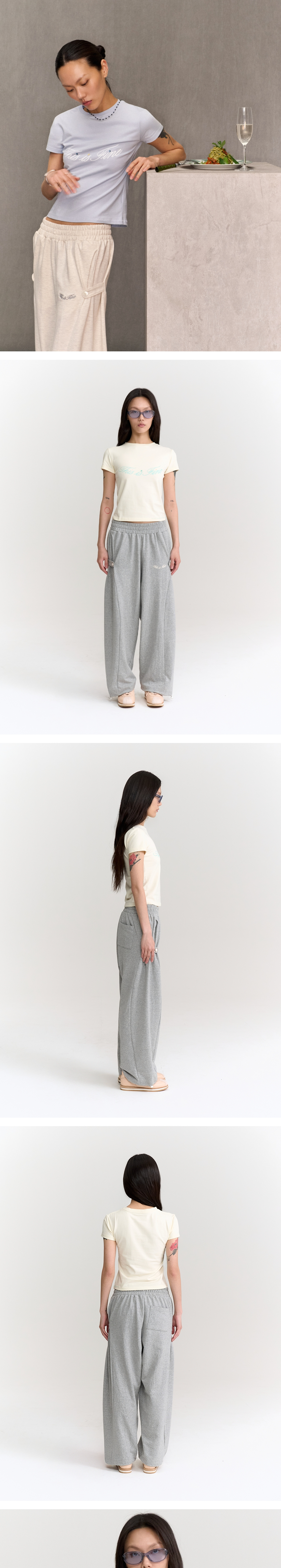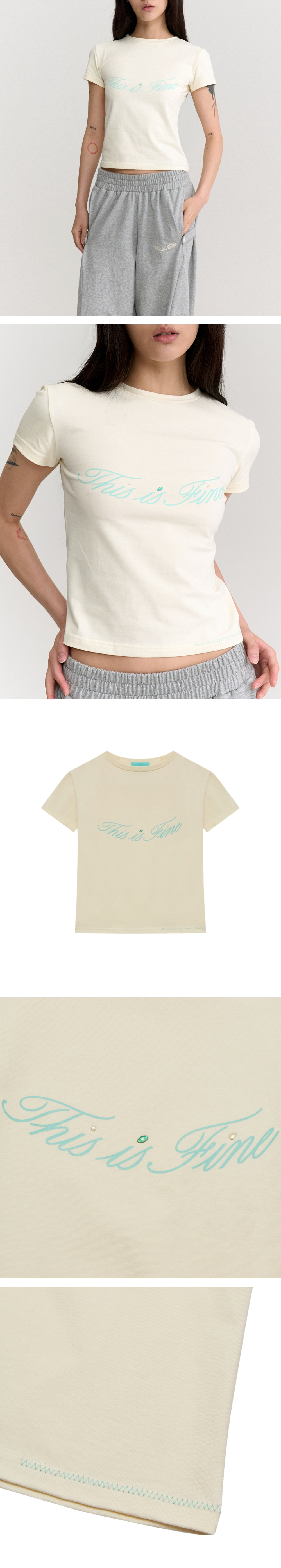 바디를 따라 부드럽게 흐르는 실루엣, 살짝 드러나는 허리선이 그대의 특별한 일상을 완성합니다. ✓ 허리 라인이 살아있는 슬림 핏 ✓ 부드러운 감촉과 밀도감이 살아있는 프리미엄 실켓 저지 ✓ 보석 디테일이 가미된 THIS IS FINE 로고 프린트