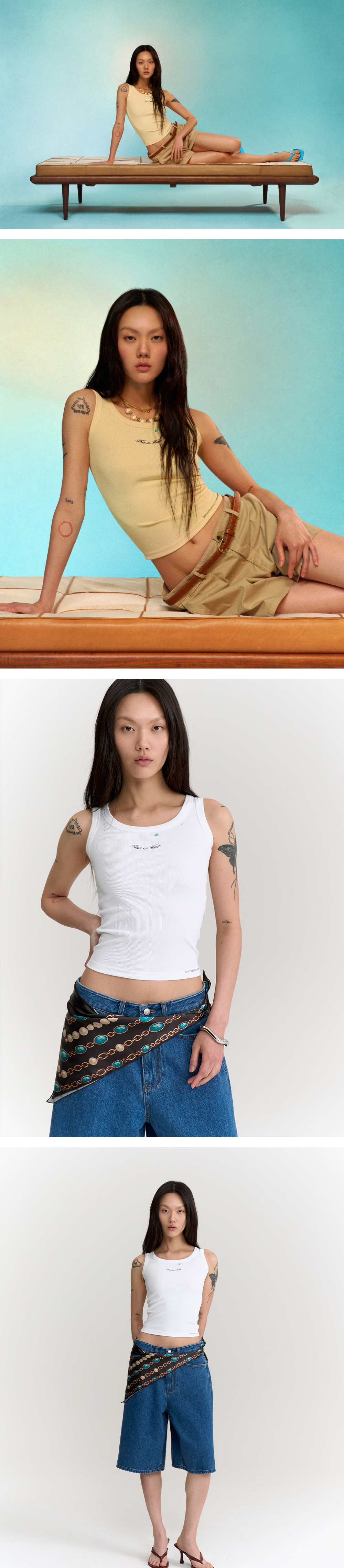 보석같이 빛나는 당신의 곡선을 가장 유연하게 감싸줄 단 하나의 슬리브리스. ✓ 친환경 고기능 원사 ‘듀퐁 소로나’ + PET 혼방으로 뛰어난 신축성과 복원력 ✓ 원사 자체에 스프링 구조가 내장된 업그레이드형 잠재권축사 사용 ✓ 통기성 우수하고 시원한 착용감, 잦은 세탁에도 형태 안정 ✓ 지그재그 스티치와 1도 핸드프린팅, 정제된 로고 디테일 ✓ 넥라인에 적용된 인피니트 스톤이 슬리브리스를 감각적으로 완성