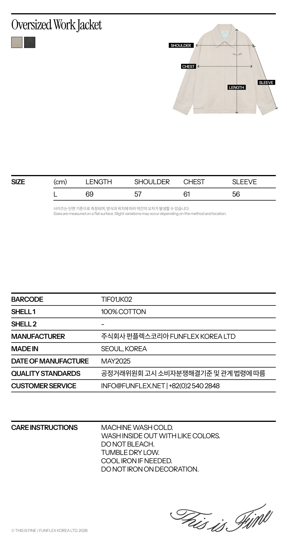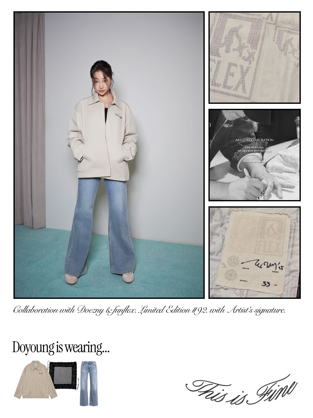 더즈니 작가의 작품을 입는 경험. 안감에 아트워크 프린트, 작가 서명과 에디션 넘버가 더해진 한정판. ✓ DOEZNY x THIS IS FINE x FUNFLEX 작가 협업으로 만들어진 한정판 ✓ 작품이 적용된 안감과 스페셜 라벨에 친필 사인 및 에디션 넘버 각인 (#1~92) ✓ 친환경 피그먼트 바이오 워싱 코튼 트윌 소재