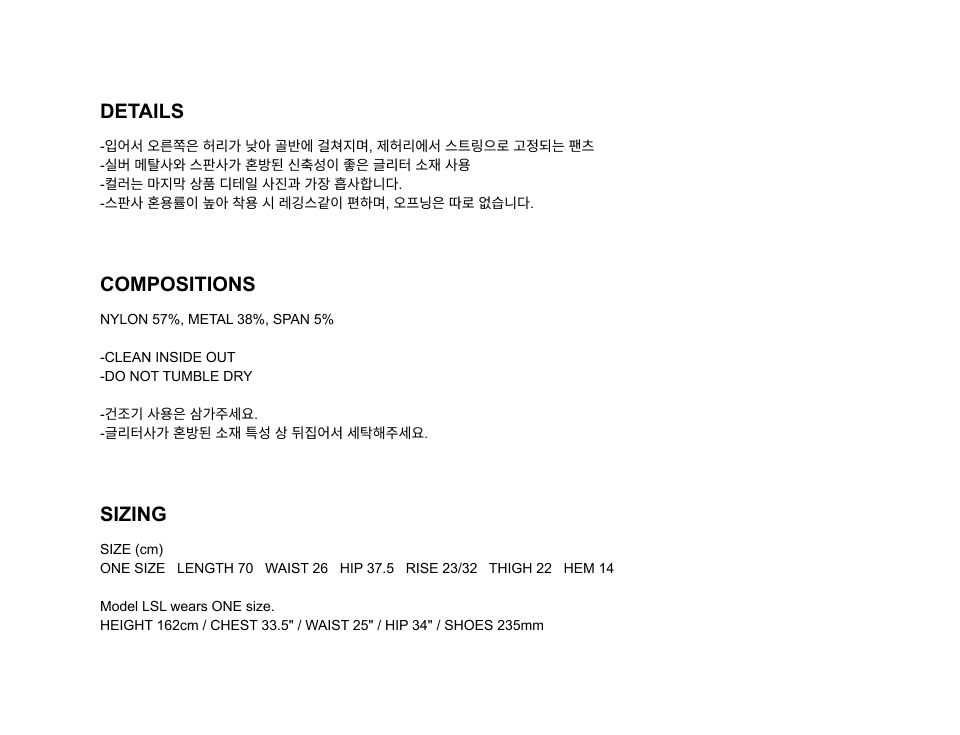 | LENGTH | WAIST | HIP | RISE | THIGH | HEM |