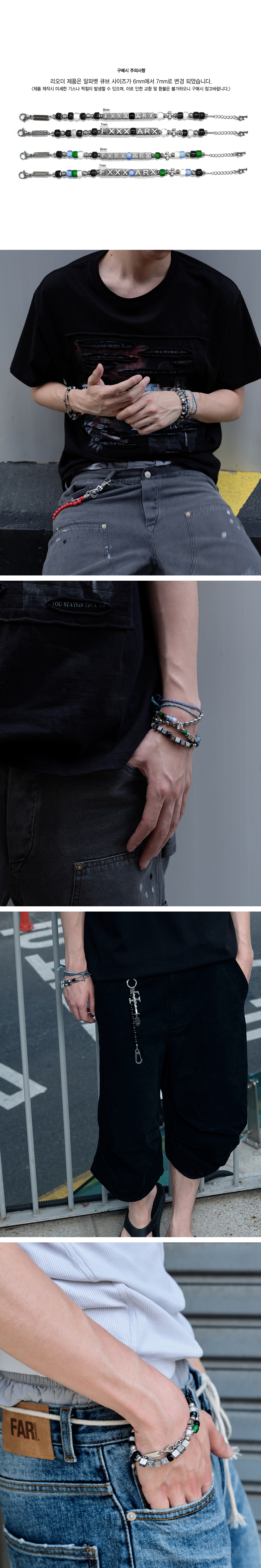 FAR_FXXXARX BEAD BRACELET_MULTI’은 브랜드의 아이덴티티를 담은 알파벳 큐브 비즈와 꼬임 스트랩, 크로스 참이 조화를 이루는 감각적인 팔찌입니다. 다양한 소재 믹스로 손목에 자연스럽게 포인트를 더해주며, 유니섹스 무드로 누구나 스타일링하기 좋은 데일리 아이템입니다 끈은 2개 색상 랜덤으로 제공되며, 직접 손목에 맞게 매듭을 지어 사용하시면 됩니다. 손목둘레에 맞게 길이 조절 가능합니다. 손목둘레 16cm ~ 18cm 착용가능합니다. 총기장은 22cm. ※리오더 제품은 알파벳 큐브의 사이즈가 6mm에서 7mm로 변경 되었습니다. 구매시 참고 바랍니다.