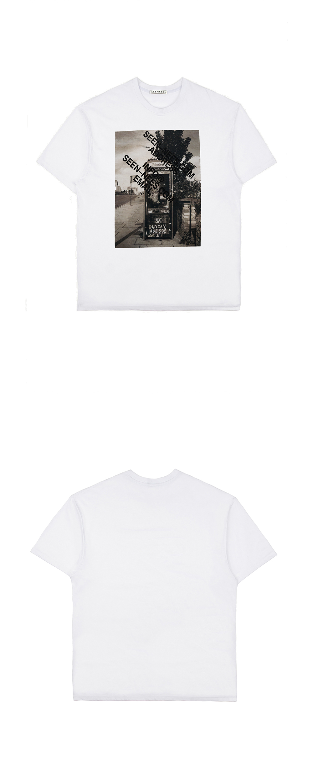 DETAIL Photo digital printing Contact logo printing Semi oversized fit Medium weight cotton jersey fabric 앞면에 디지털 프린팅, 컨택 로고 나염 프린팅 세미 오버사이즈 핏 16수 코튼 원단 COMPOSITION Cotton 100% SIZE MEASUREMENT - Size M : Length 66cm_Chest 54cm_Shoulder 49cm_Sleeve length 20cm - Size L : Length 71.5cm_Chest 56cm_Shoulder 53cm_Sleeve length 21.5cm Made in S o u t h Korea WASHING INSTRUCTIONS Dry clean recommended Hand wash cold Wash separately Do not bleach