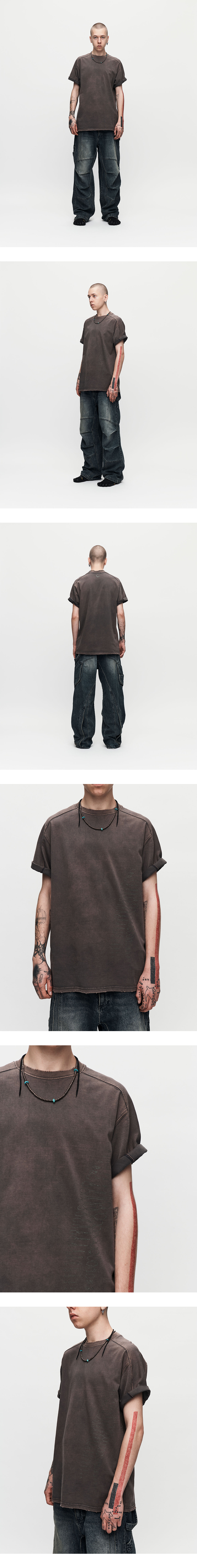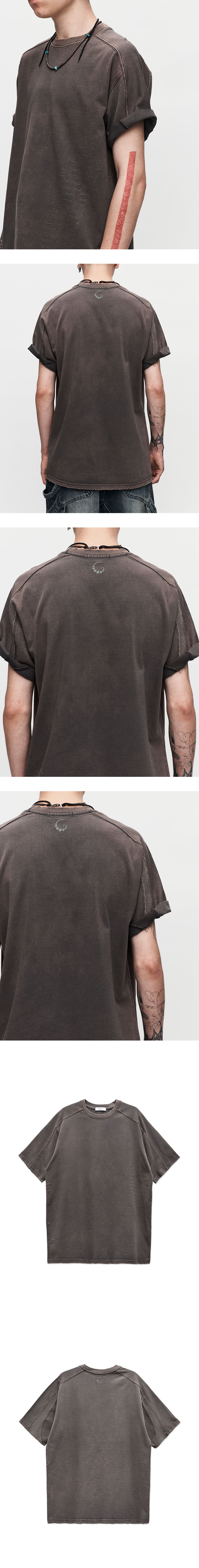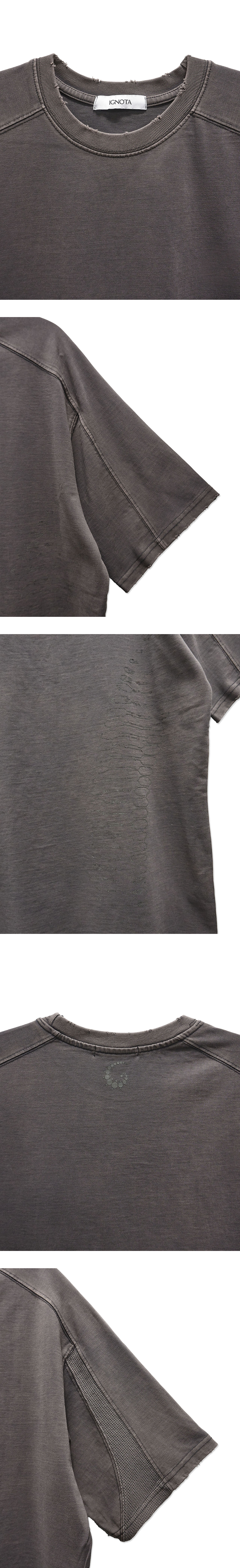 미네랄 워싱 기법 넥/소매단/밑단 데미지 디테일 후면 소매 배색 패널 전면 'FOSSIL' 그래픽 후면 'IGNOTA'심볼 그래픽