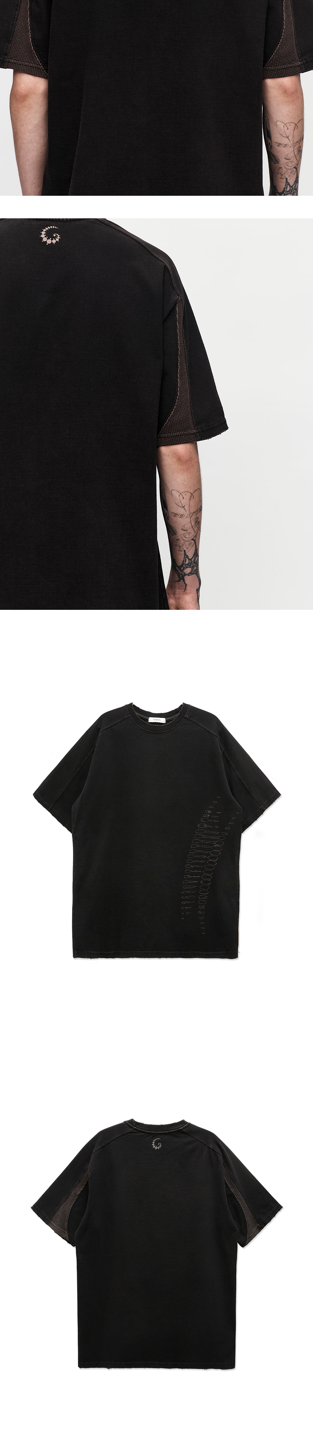 미네랄 워싱 기법 넥/소매단/밑단 데미지 디테일 후면 소매 배색 패널 전면 'FOSSIL' 그래픽 후면 'IGNOTA'심볼 그래픽