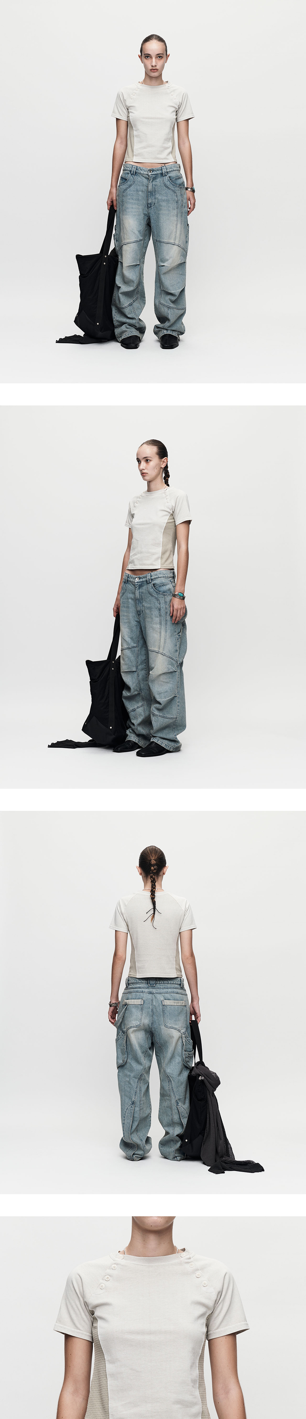 측면 배색 패널 후면 립 원단 패널 2개의 사선 버튼 디테일
