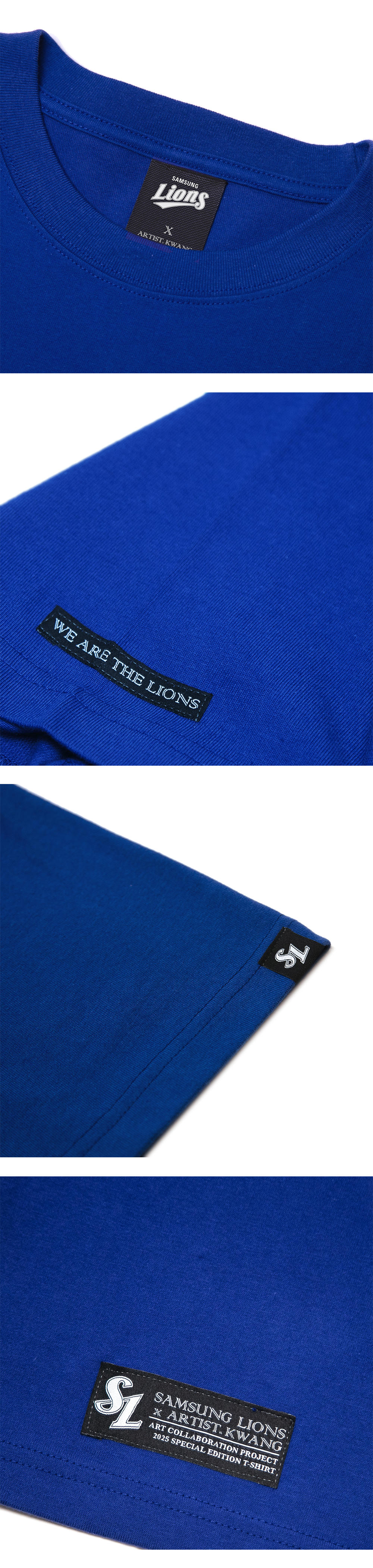 [배송 안내] 해당 상품은 예약 배송 상품으로 8월 4일부터 순차 배송 됩니다. [상품 구성] 최고급 16수 티셔츠 SL라벨 손잡이 파우치 동봉 아크릴 선수 키링 포함 일러스트 엽서 특전 [상품 정보] 앞면 왼쪽 가슴 : 선수 시그니처 포즈 + 영문명 엠블럼 그래픽 앞 허리 라벨 : 콜라보레이션 한정판 스페셜 라벨 좌/우 소매 라벨 : SL 로고 / ‘WE ARE THE LIONS’ 문구 뒷면 : 대형 선수 일러스트 + 백넘버 + 작가 캘리그라피 선수명 공식 삼성라이온즈 넥라벨 부착