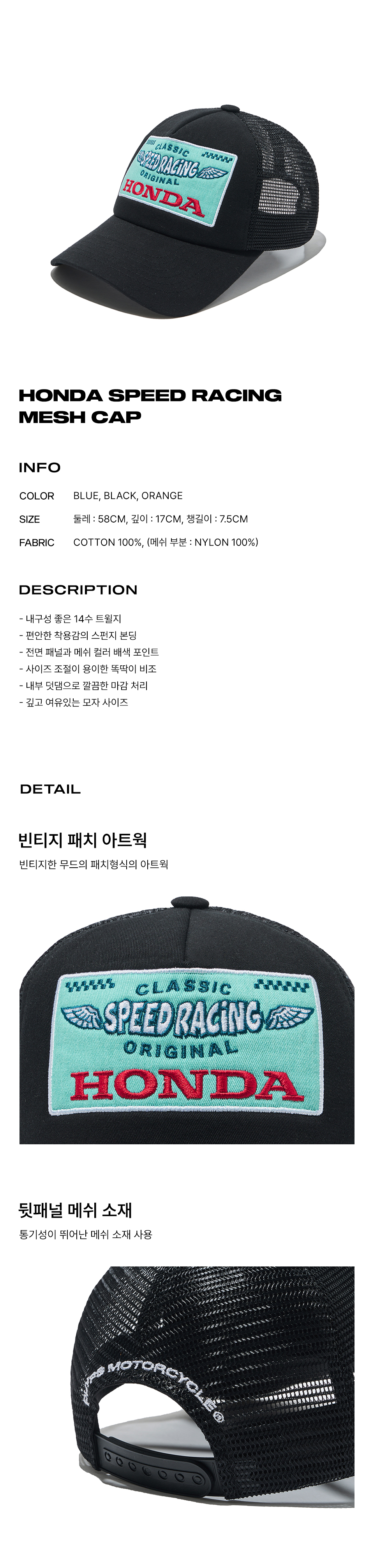혼다 스피드 레이싱 메쉬 캡 블랙
