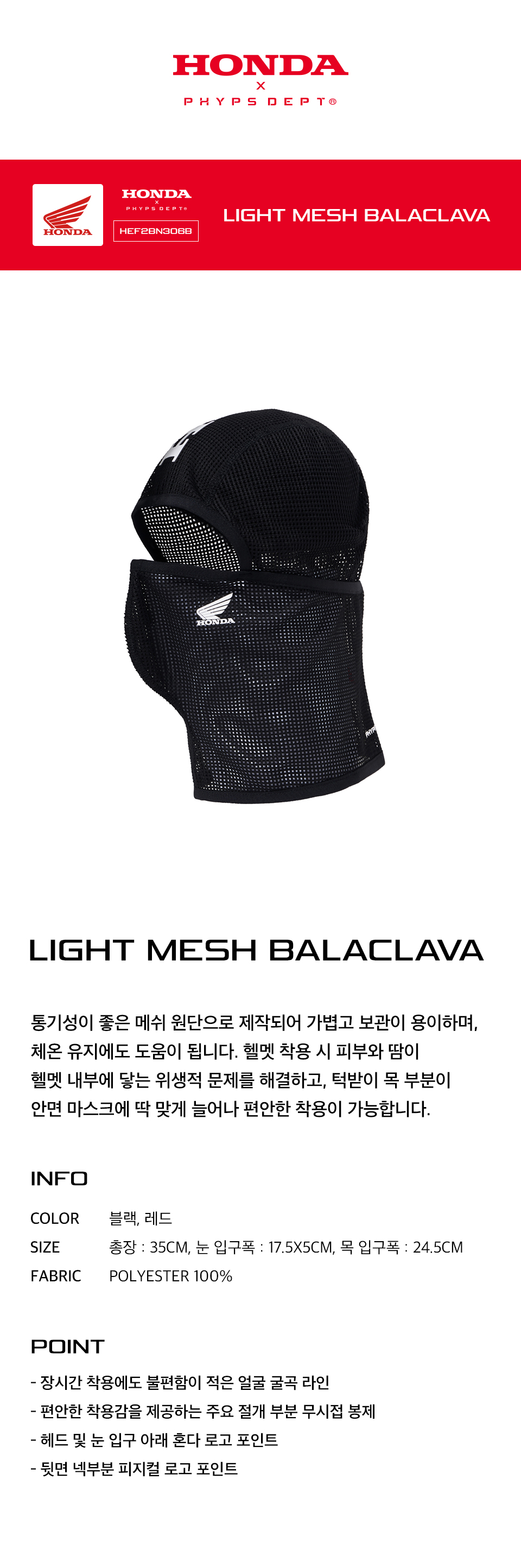 혼다 라이트 메쉬 바라클라바 블랙