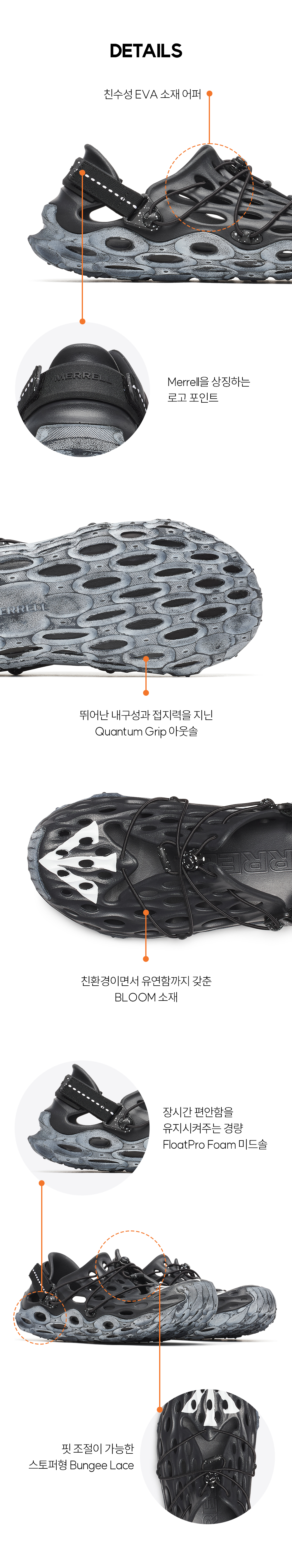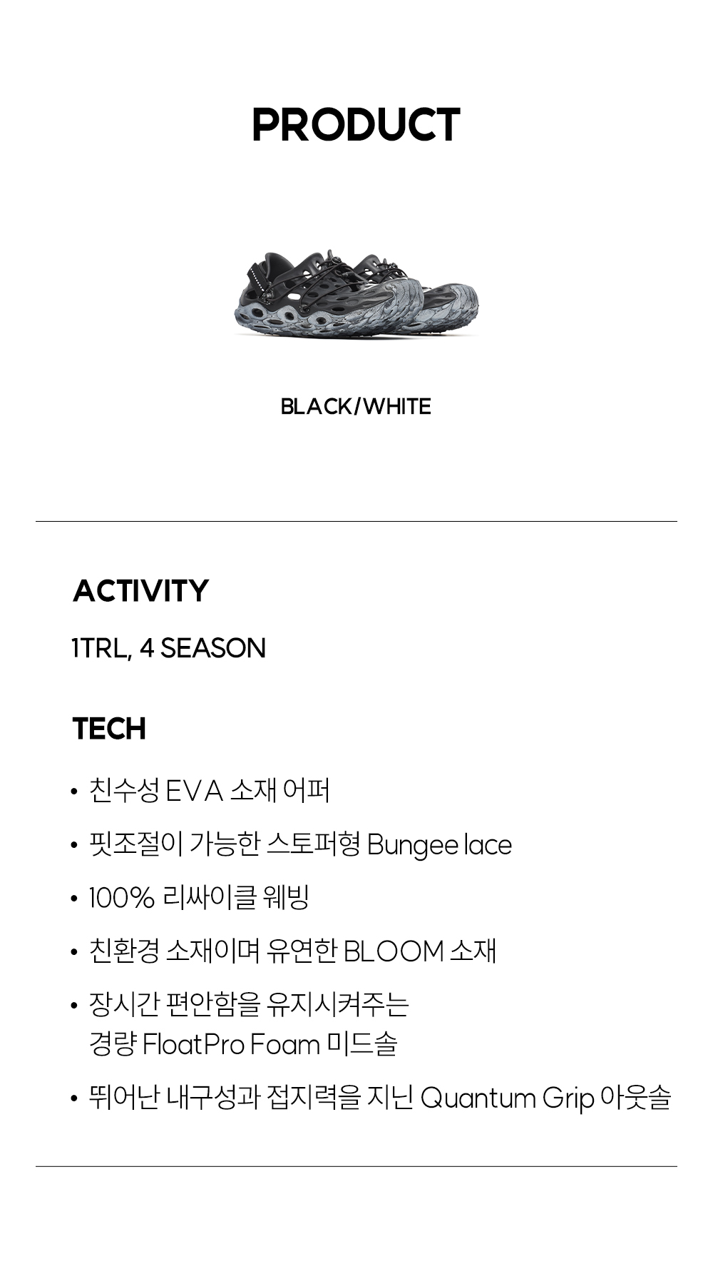 더위와 스타일 모두 챙길 수 있는 머렐 x 이스트로그 하이드로 목 AT 케이지 블랙 화이트입니다. - 친수성 EVA 소재 어퍼 - 핏조절이 가능한 스토퍼형 Bungee lace - 100% 리싸이클 웨빙 - 친환경 소재이며 유연한 BLOOM 소재 - 장시간 편안함을 유지시켜주는 경량 Float Pro Foam 미드솔 - 뛰어난 내구성과 접지력을 지닌 Quanturn Grip 아웃솔