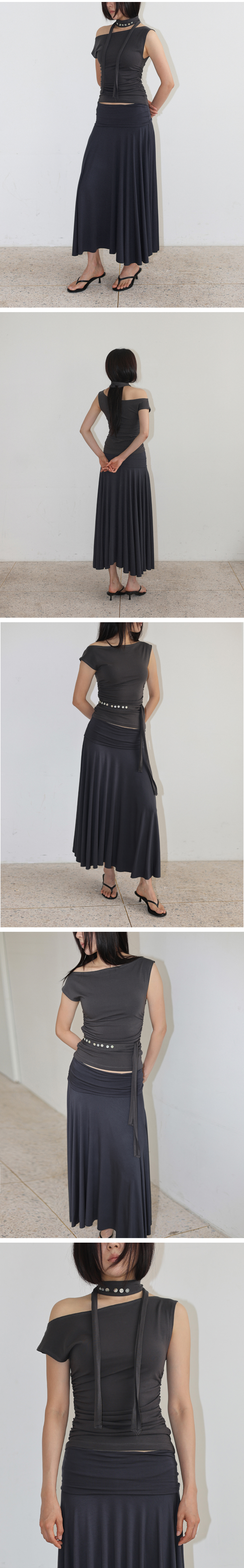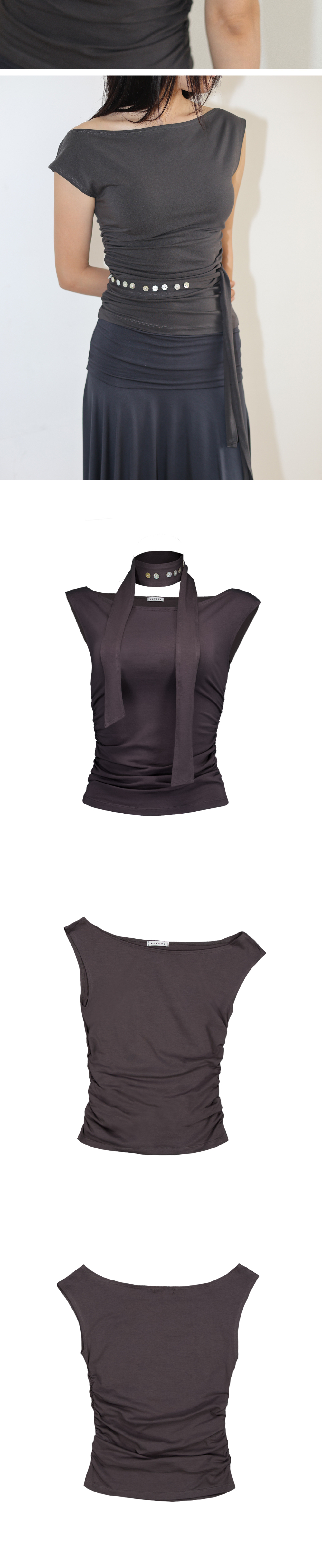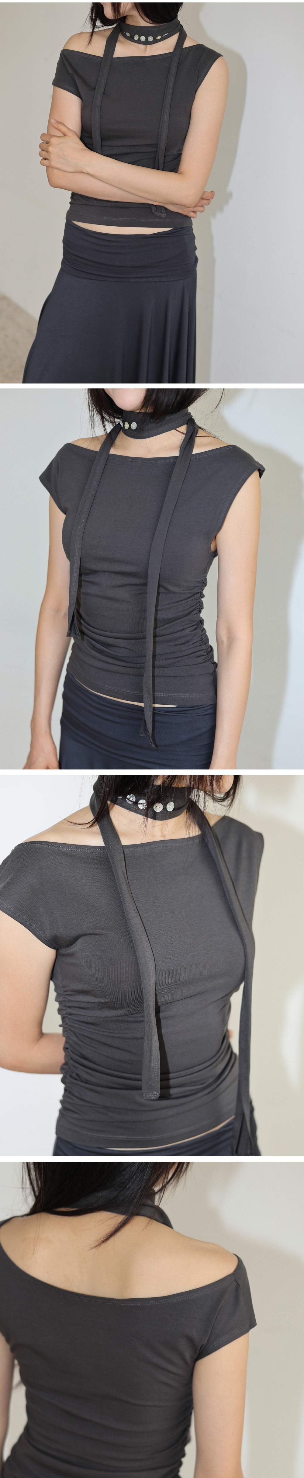 자개버튼 디테일의 스카프와 언발런스 숄더 디테일 탑 고급 피마 코튼 소재로 실크처럼 부드러운 촉감 언발란스한 어깨선 포인트 허리 옆선 셔링 디테일 자개 단추 디테일의 스카프