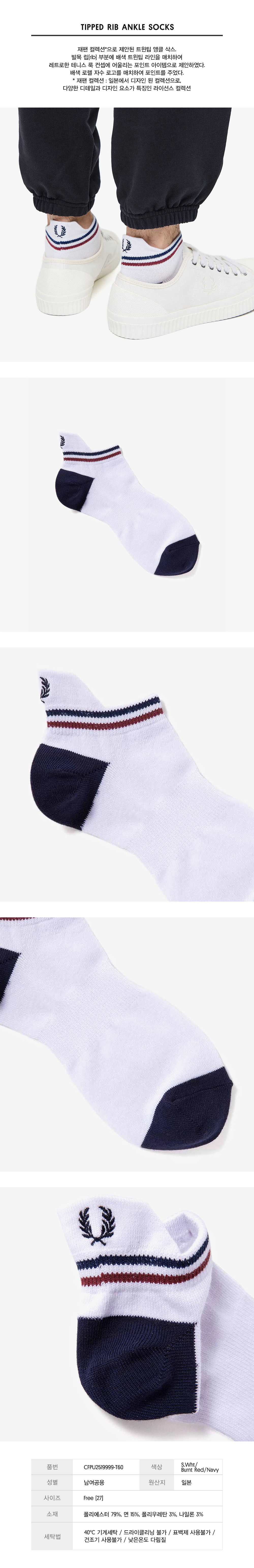 프레드페리 JP 팁 립 앵클 삭스 스노우화이트 번트 레드 네이비
