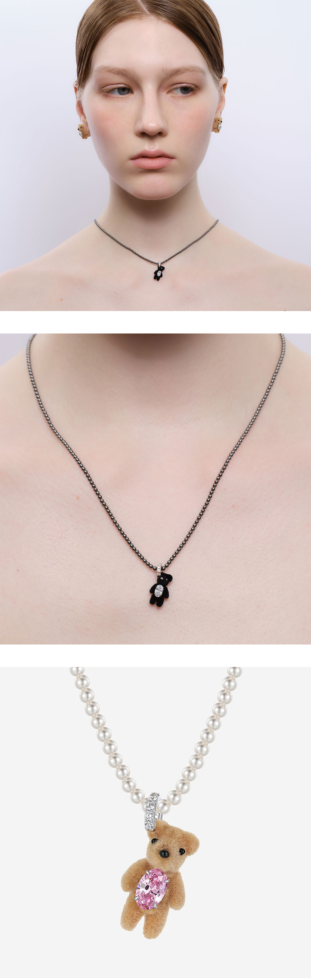 핑크색 지르콘 보석 가슴에 품은 곰돌이 인형이 달린 펄 네클리스입니다. - "보석에 새긴 옷감"의 의미를 담은 Paradise 컬렉션 - 프롱 세팅된 링으로 연결된 브라운 컬러의 곰돌이 인형 - 화이트 컬러의 펄 네클리스 * 모델 컷은 참고를 위한 이미지이며 같은 제품의 다른 컬러 제품입니다.