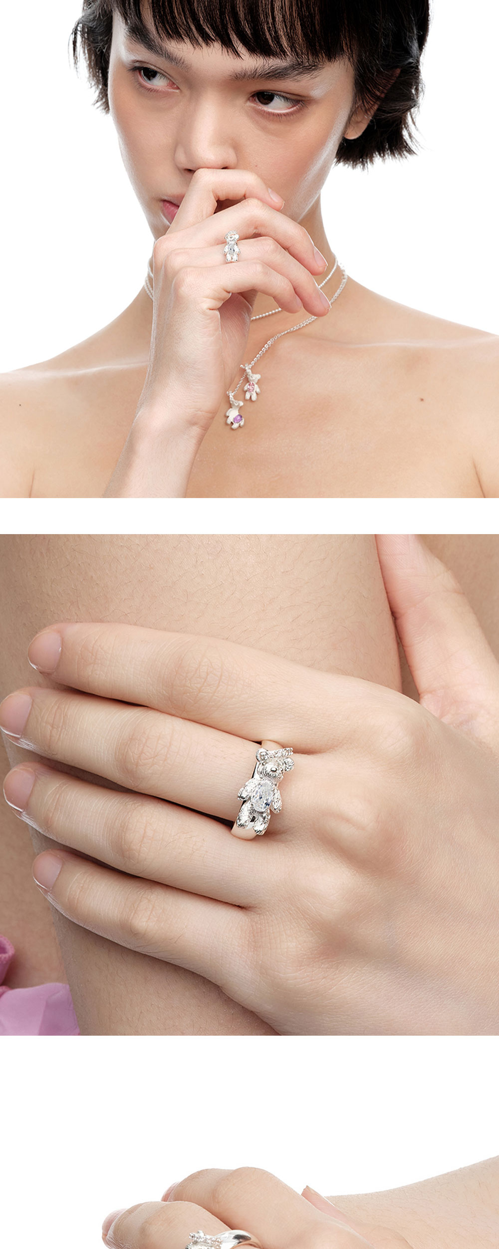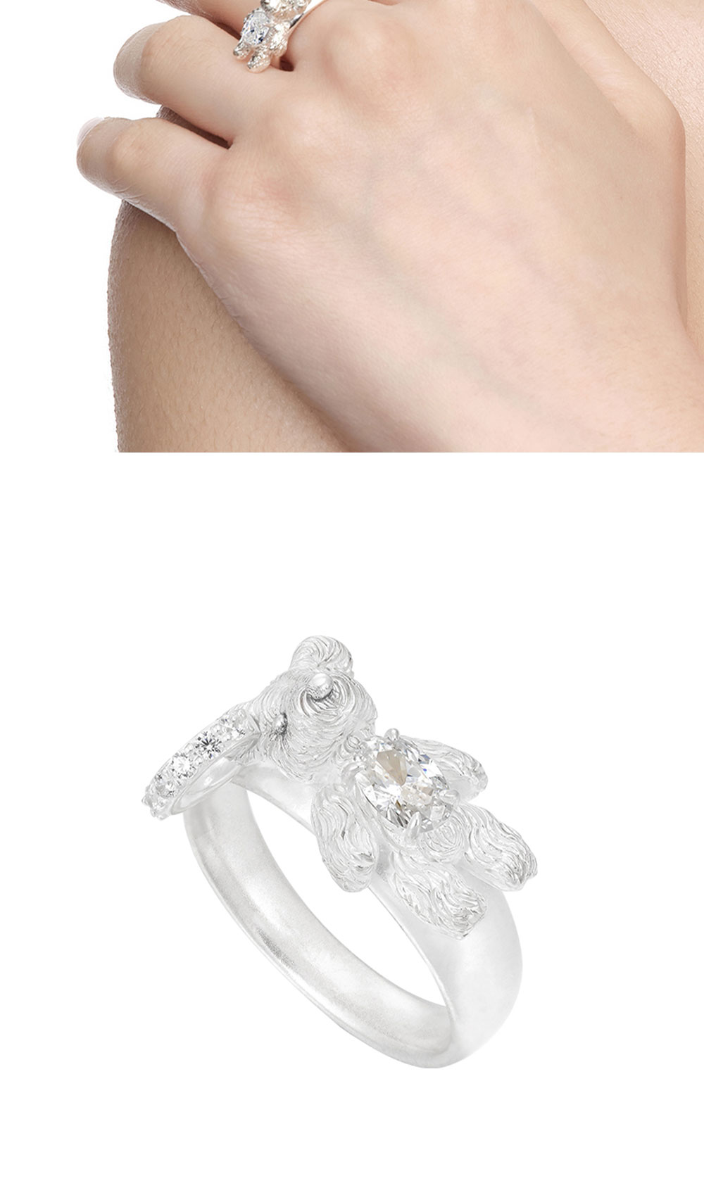 화이트 지르콘 보석을 가슴에 품고 있는 디자인의 카브드 메탈 미니 베어 링입니다. - 링을 따라 누워있는 미니 베어 디자인 - 미니 베어 귀에 박힌 피어싱 장식 - 화이트 지르콘 보석