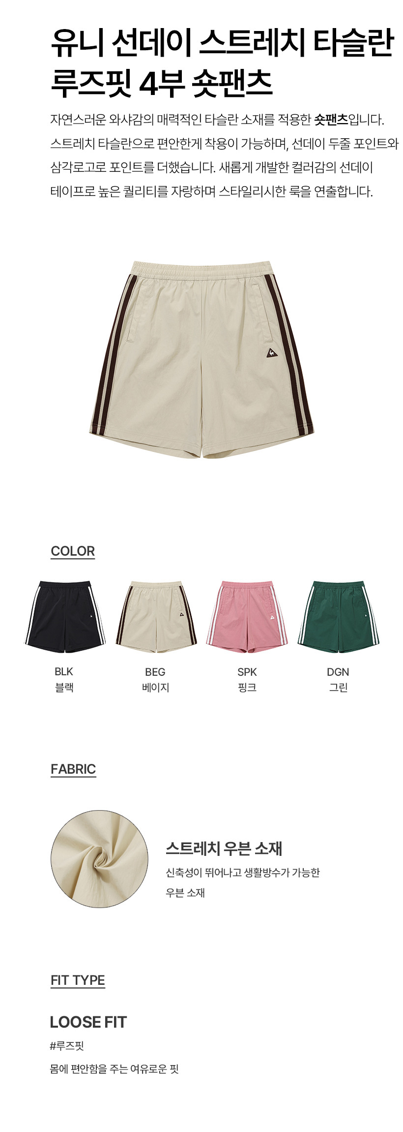 르꼬끄 스포르티브 유니 선데이 스트레치 타슬란 루즈핏 4부 숏팬츠 - 그린(QQ323LHP81)