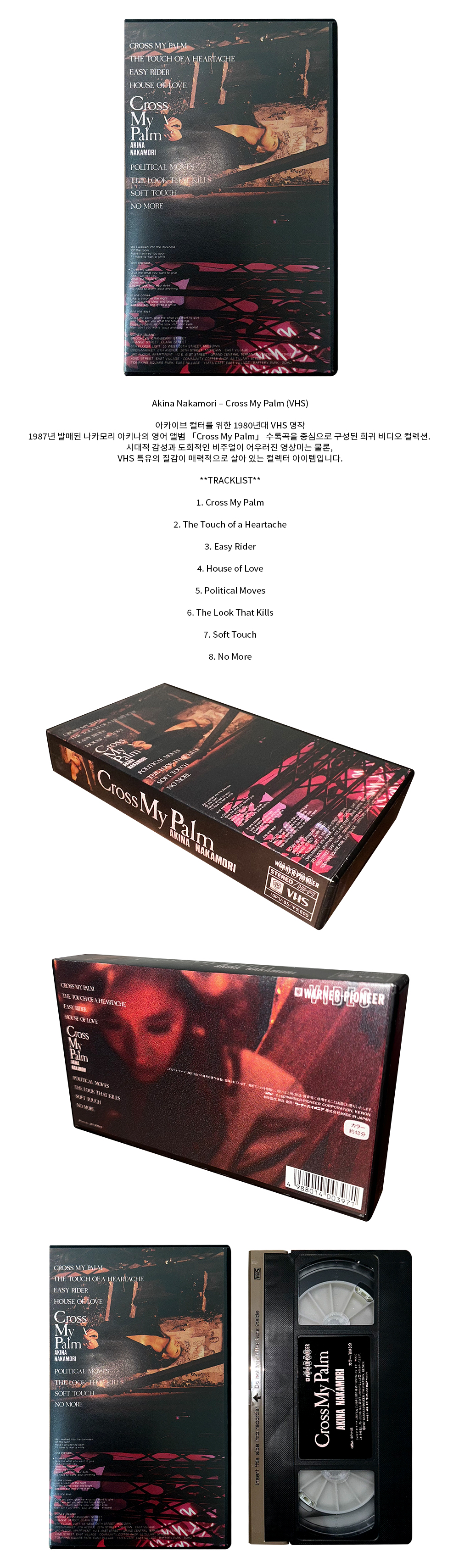 Akina Nakamori – Cross My Palm (VHS) 아카이브 컬터를 위한 1980년대 VHS 명작 1987년 발매된 나카모리 아키나의 영어 앨범 「Cross My Palm」 수록곡을 중심으로 구성된 희귀 비디오 컬렉션. 시대적 감성과 도회적인 비주얼이 어우러진 영상미는 물론, VHS 특유의 질감이 매력적으로 살아 있는 컬렉터 아이템입니다.