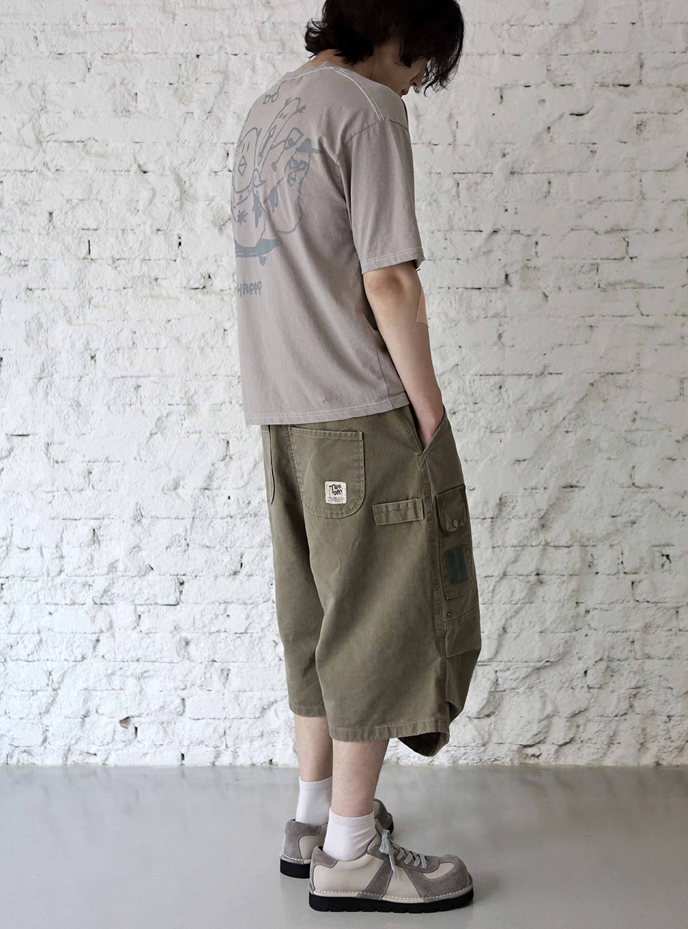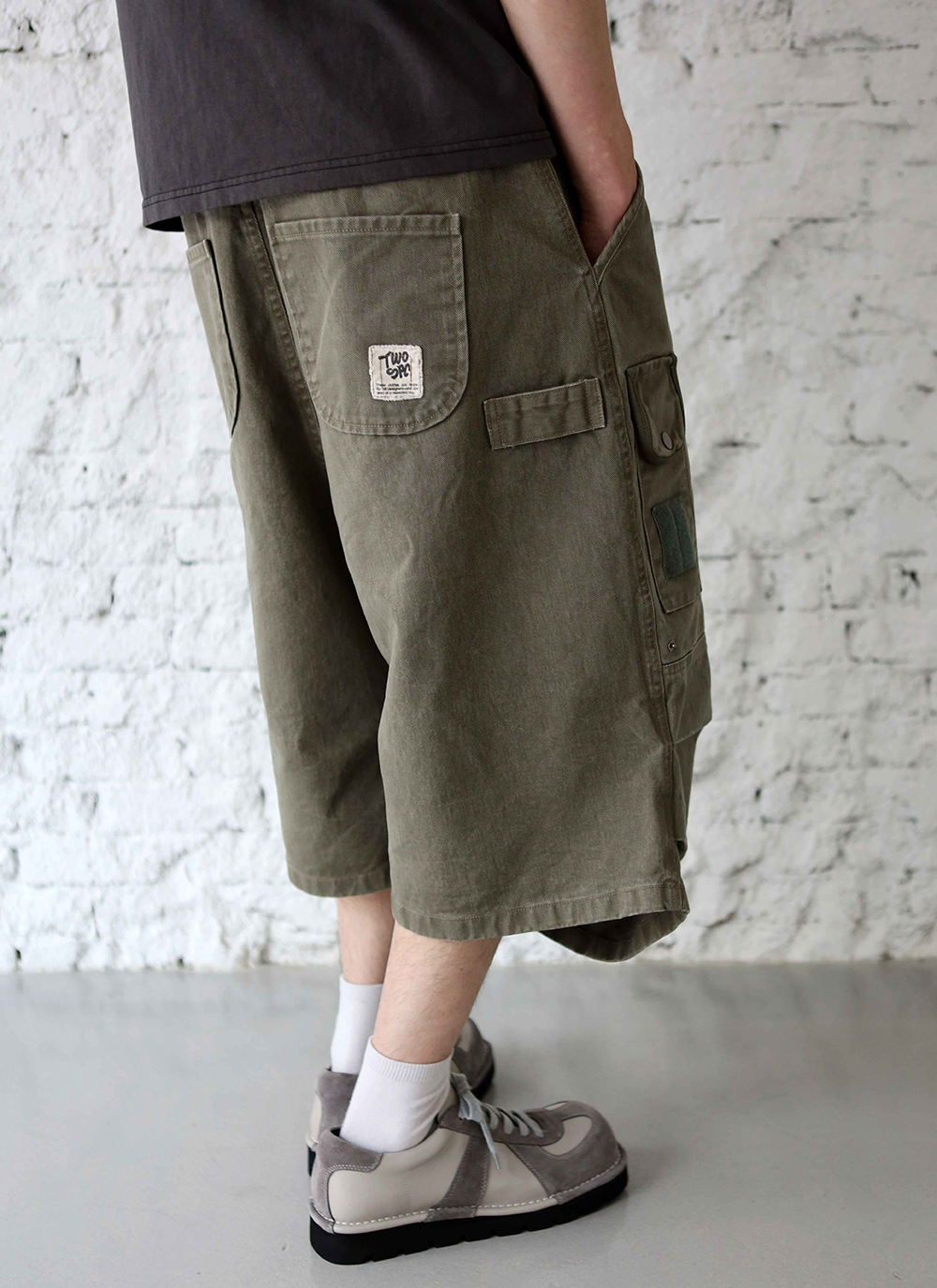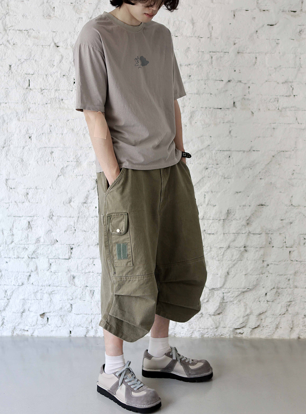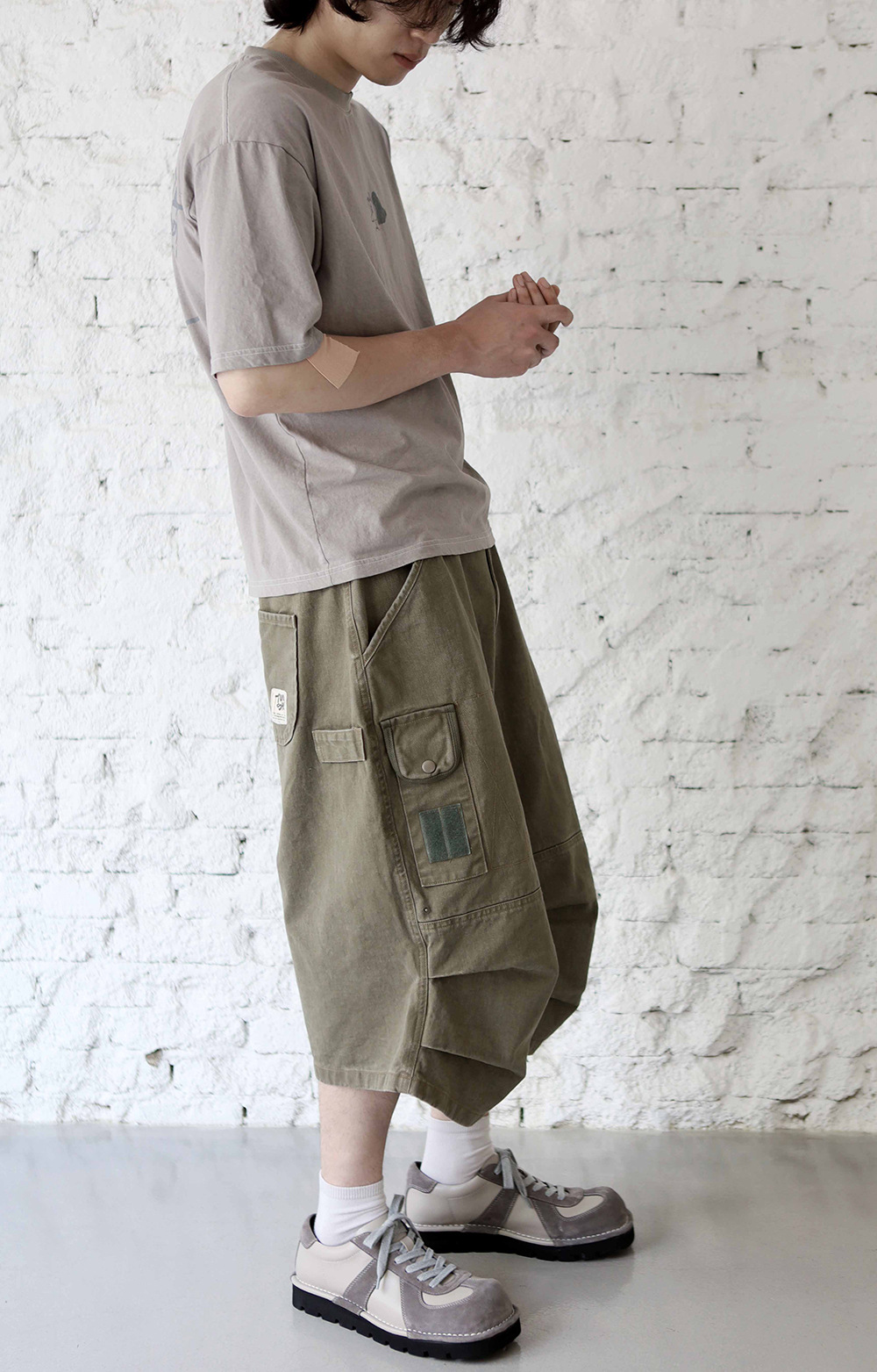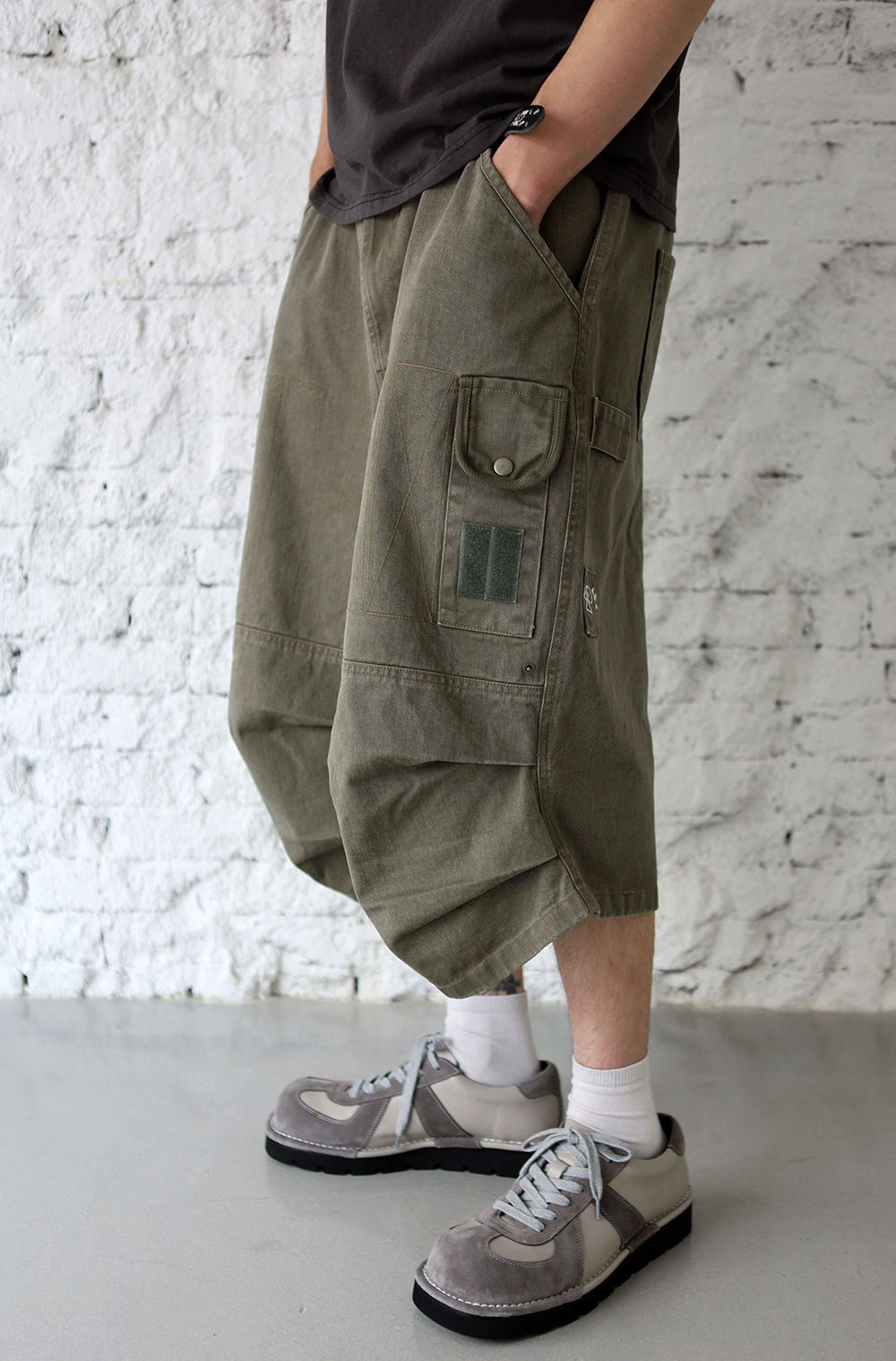 [비트리_카키] 버뮤다 팬츠. 밀리터리에서 영감을 받아 위트있는 디테일들로 재해석한 와이드 핏 버뮤다 팬츠입니다. 자연스럽게 무게중심을 잡아주는 실루엣 위로 다양한 요소들이 빈티지하게 녹여져 있습니다. *소재 - cotton 100% *사이즈 2 : 허리 40 기장 64 허벅지 33 밑단 34 3 : 허리 42 기장 66 허벅지 35 밑단 35 4 : 허리 44 기장 68 허벅지 37 밑단 36 5 : 허리 46 기장 70 허벅지 39 밑단 37 (남)모델 : 키 183cm / 보통 체형 > 5사이즈 착용 (4사이즈 정핏)