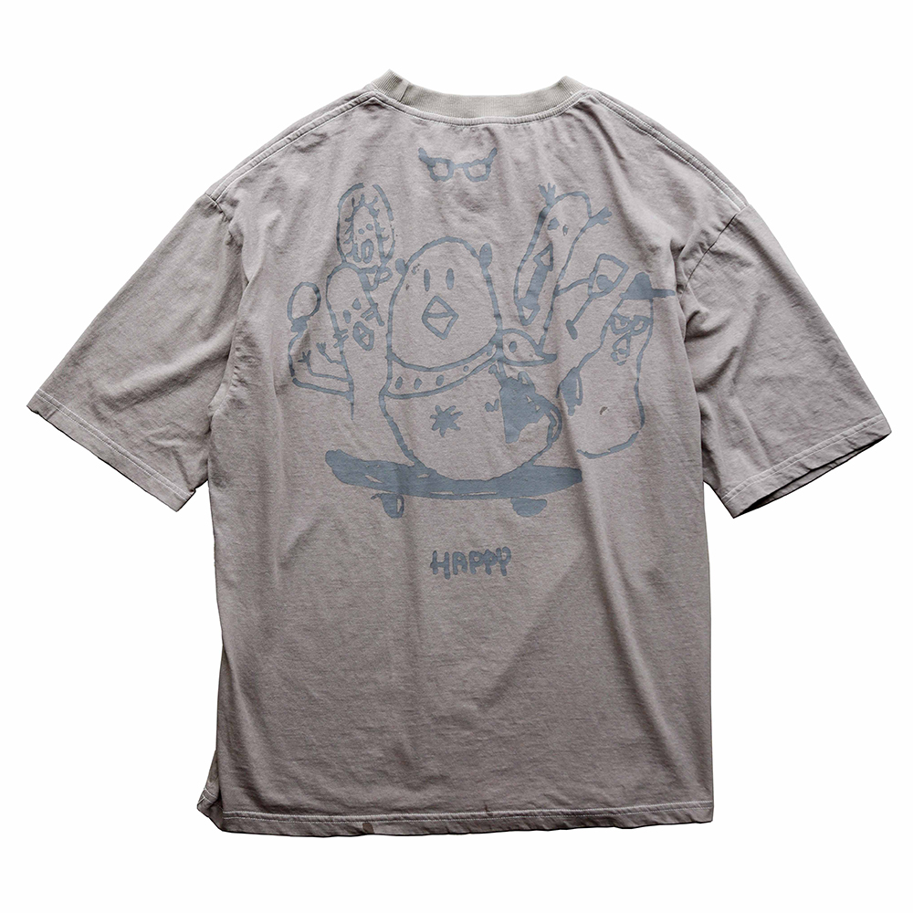 [해피덕_라이트그레이] 반팔 티셔츠. 지저귀며 노래하는 행복한 오리 밴드를 그려내어 빈티지한 무드로 제작했습니다. 앞면에는 "나는 새"라고 외치는 오리와 뒷면에는 오리들의 행복한 일상으로 다르게 표현했습니다. 오버한 핏에 빈티지한 색감이 매력적인 제품입니다. *소재 - cotton 100% *사이즈 2 : 어깨 55 가슴 56 소매 24 총장 69 3 : 어깨 57 가슴 58 소매 25 총장 71 (남)모델 : 키 183cm / 보통 체형 > 2사이즈 착용 (3사이즈 정핏)