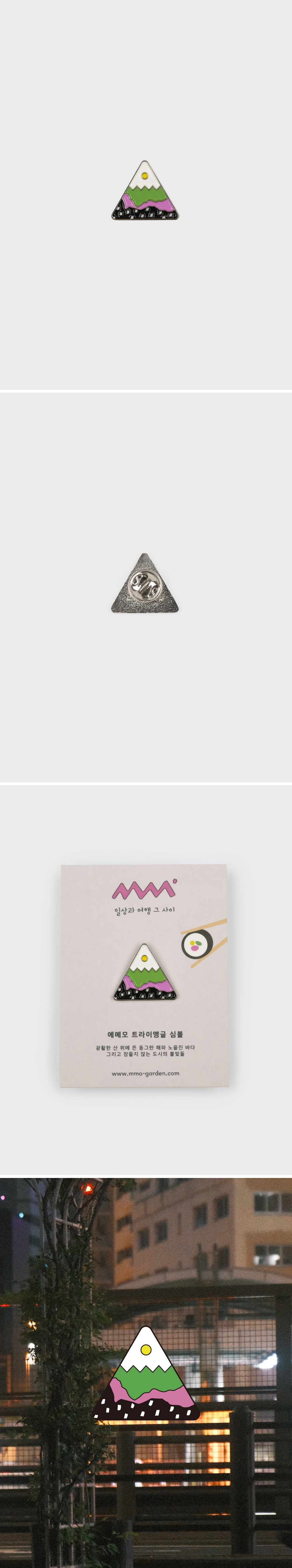 에메모 트라이앵글 심볼 "광활한 산 위에 뜬 동그란 해와 노을진 바다 그리고 잠들지 않는 도시의 불빛들" - 옷이나 가방 등 원하는 곳에 포인트를 줄 수 있는 에메모 뱃지 - 실버 컬러의 테두리로 은은한 포인트 material : metal size(cm) : 가로 2.3 / 세로 2 / 무게 약 3g - 충격에 의한 변형 또는 파손의 위험이 있으므로 주의하세요. - 메탈 소재 특성상 스크래치가 있을 수 있습니다. - 옷핀에 찔리지 않도록 주의하세요. - 어린이용 제품이 아닙니다. 입에 넣거나 삼키지 않도록 주의하세요. - 모니터, 휴대기기의 해상도와 컬러에 따라 이미지의 색상에 차이가 있을 수 있습니다. - 공간 조명의 색온도 주광색, 주백색, 전구색에 따라 제품 컬러가 다르게 보일 수 있습니다.