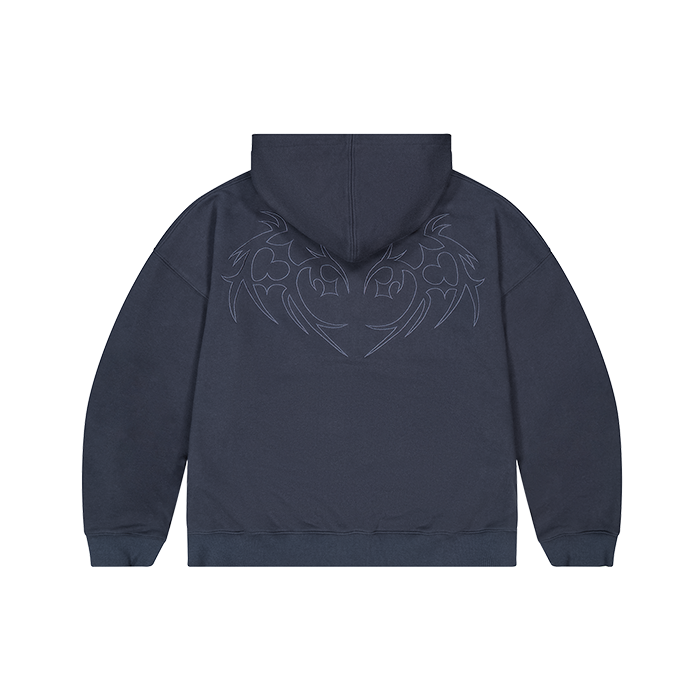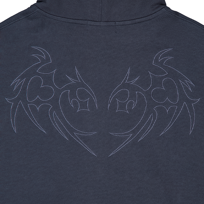 Comment Gazeroshin, 『악마 고양이』 만화에서 파생된 악마의 날개 그래픽입니다. 둥글고 따뜻한 느낌의 하트 모양을 갖고 있지만 그와 반대로 뾰족하게 뻗고 있는 가시 모양도 갖고 있습니다. 영원히 사랑할 테지만 사랑하지 않을 것임을 다짐하는 악마 고양이를 상징하기도 합니다. - Cropped Loose Fit - 후면 자수 - 제품 내부 넥라인 아이보리 생지 바이어스 테이프 사용