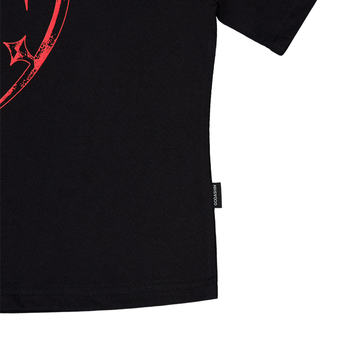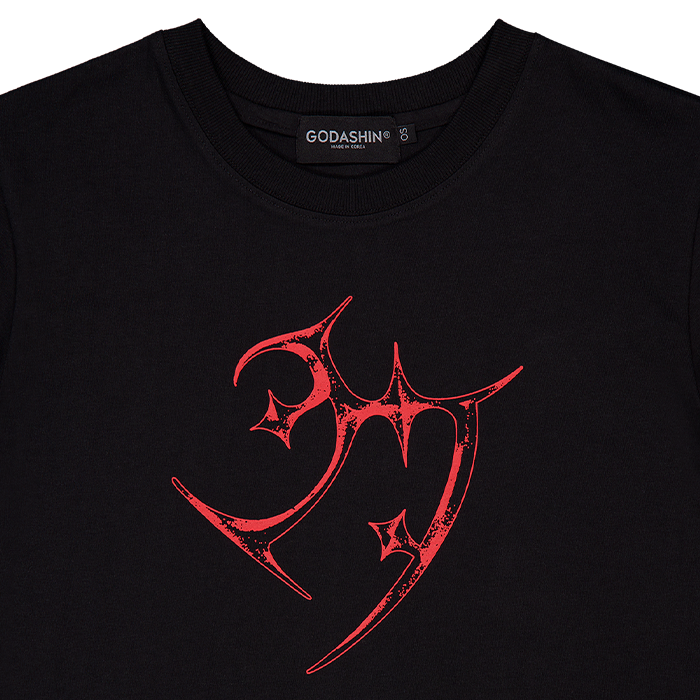 Comment Gazeroshin, 『악마 고양이』 만화에서 파생된 악마의 날개 그래픽입니다. 둥글고 따뜻한 느낌의 반쪽 하트 모양을 갖고 있지만 그와 반대로 뾰족하게 뻗고 있는 가시 모양도 갖고 있습니다. 영원히 사랑할 테지만 사랑하지 않을 것임을 다짐하는 악마 고양이를 상징하기도 합니다. - Cropped Regular Fit - 전면 프린팅