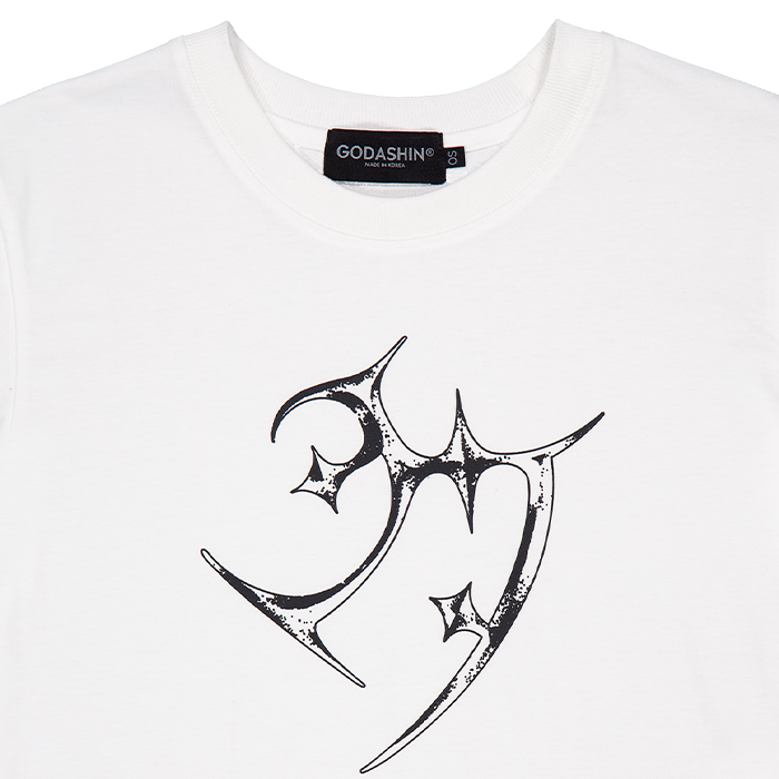 Comment Gazeroshin, 『악마 고양이』 만화에서 파생된 악마의 날개 그래픽입니다. 둥글고 따뜻한 느낌의 반쪽 하트 모양을 갖고 있지만 그와 반대로 뾰족하게 뻗고 있는 가시 모양도 갖고 있습니다. 영원히 사랑할 테지만 사랑하지 않을 것임을 다짐하는 악마 고양이를 상징하기도 합니다. - Cropped Regular Fit - 전면 프린팅