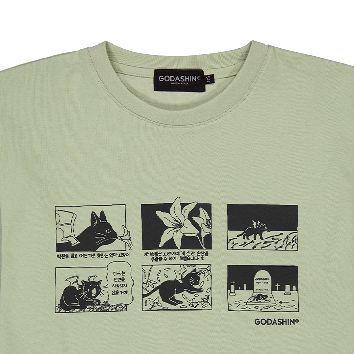 Comment Gazeroshin, 『악마 고양이』 만화입니다. 영원한 삶을 사는 악마 고양이가 먼저 떠난 주인을 그리워하는 장면을 담았습니다. 제품에 녹여진 한글은 저의 그림과 잘 어우러져 이제는 고다신만의 독창적인 스타일이라고 할 수 있겠습니다. - Loose Fit - 블렌딩 원단으로 부드러운 촉감 - 전면 프린팅
