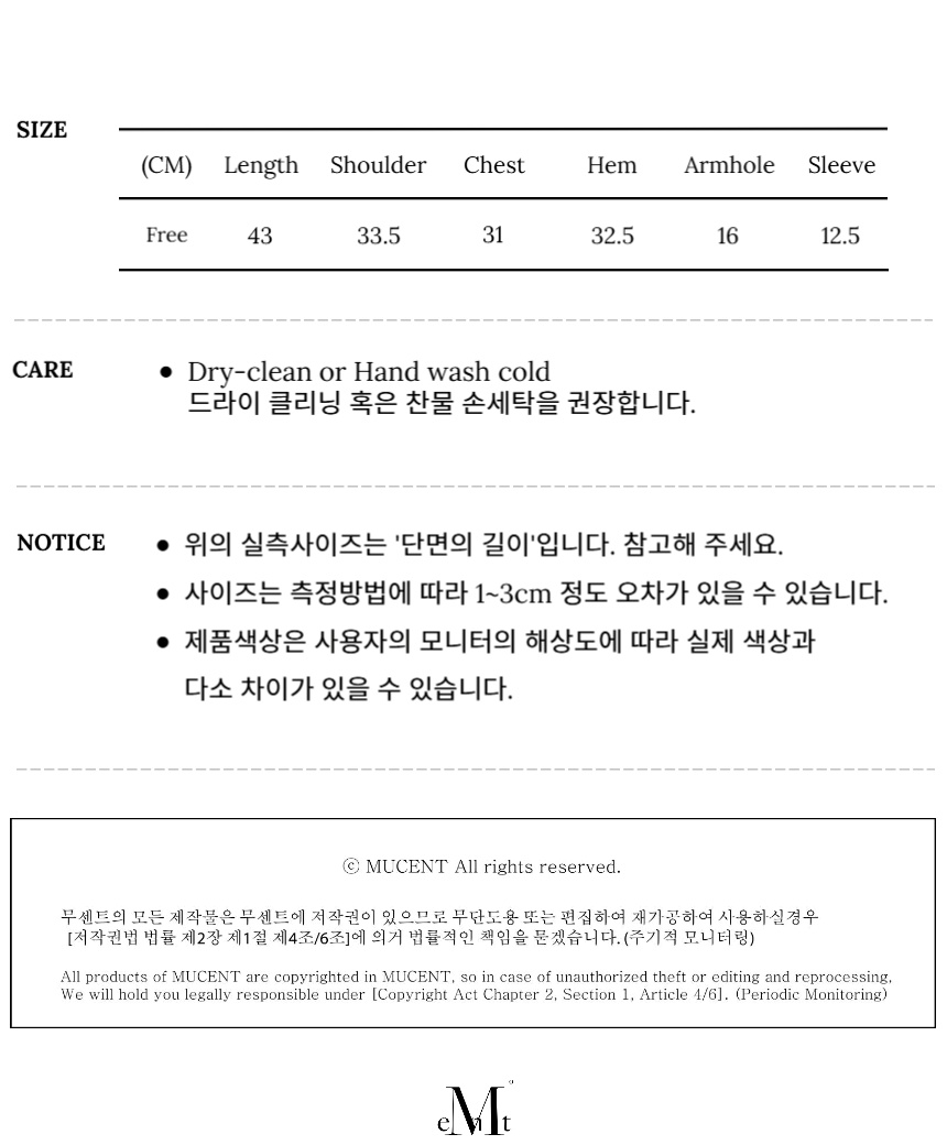 ┃Detail • 브이넥 라인의 반팔 티 • 크롭한 기장감 • 전면 무센트 자수 포인트 • 쫀쫀한 텍스처감으로 편안한 착용감 • 단품, 이너로 모두 활용가능한 데일리 아이템 • 신축성 좋은 원단으로 편안한 착용감 ┃Material : Cotton 100% ┃Care : Dry cleaning - 무센트는 말기의 행성인 이 지구에서 지속 가능한 옷들을 고민합니다. 우리는 신념을 소비하는 미닝아웃을 지지합니다.