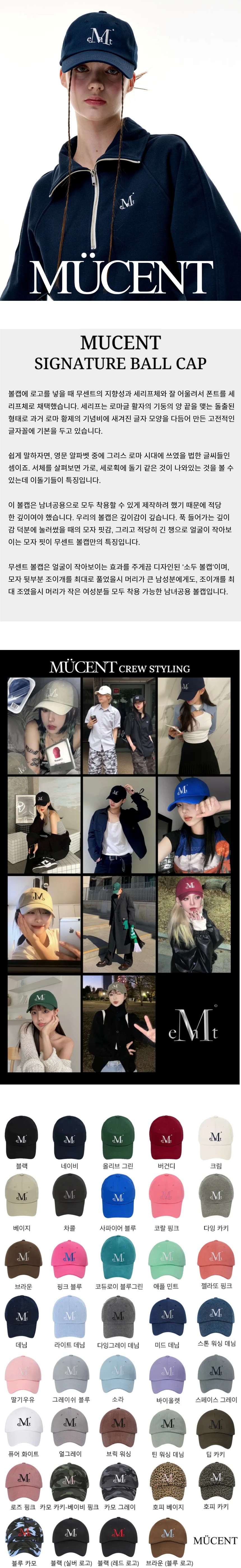 ┃Detail 볼캡에 로고를 넣을 때 무센트의 지향성과 세리프체와 잘 어울려서 폰트를 세 리프체로 채택했습니다. 세리프는 로마글 활자의 기둥의 양 끝을 맺는 돌출된 형태로 과거 로마 황제의 기념비에 새겨진 글자 모양을 다듬어 만든 고전적인 글자꼴에 기본을 두고 있습니다. 이 볼캡은 남녀공용으로 모두 착용할 수 있게 제작하려 했기 때문에 적당 한 깊이여야 했습니다. 우리의 볼캡은 깊이감이 깊습니다. 푹 들어가는 깊이 감 덕분에 눌러썼을 때의 모자 핏감, 그리고 적당히 긴 챙으로 얼굴이 작아보 이는 모자 핏이 무센트 볼캡만의 특징입니다. ┃Material : Cotton 100% ┃Care : Dry Cleaning