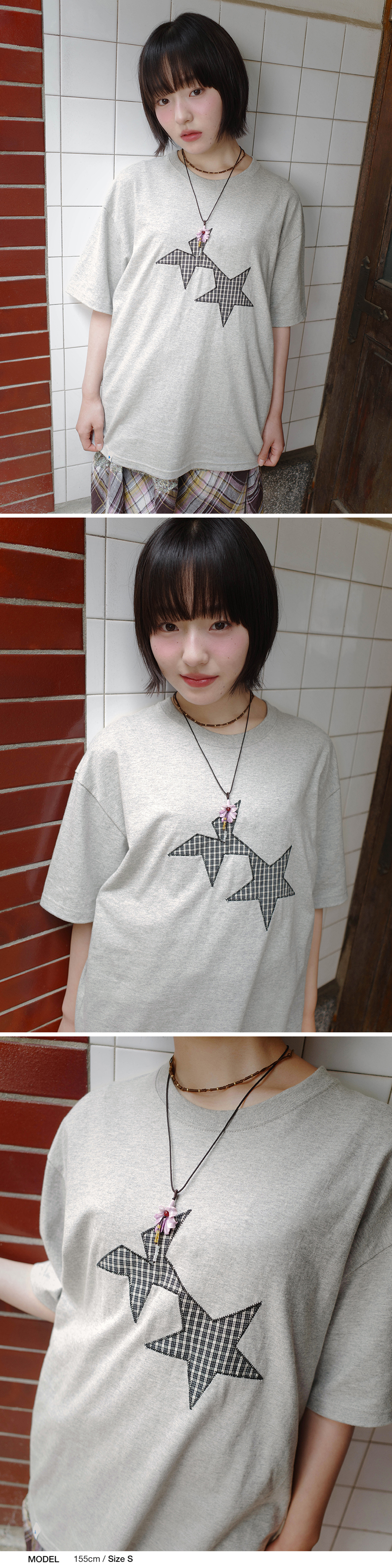 카비시 트윈 스타 체크 아플리케 숏슬리브 티셔츠 그레이