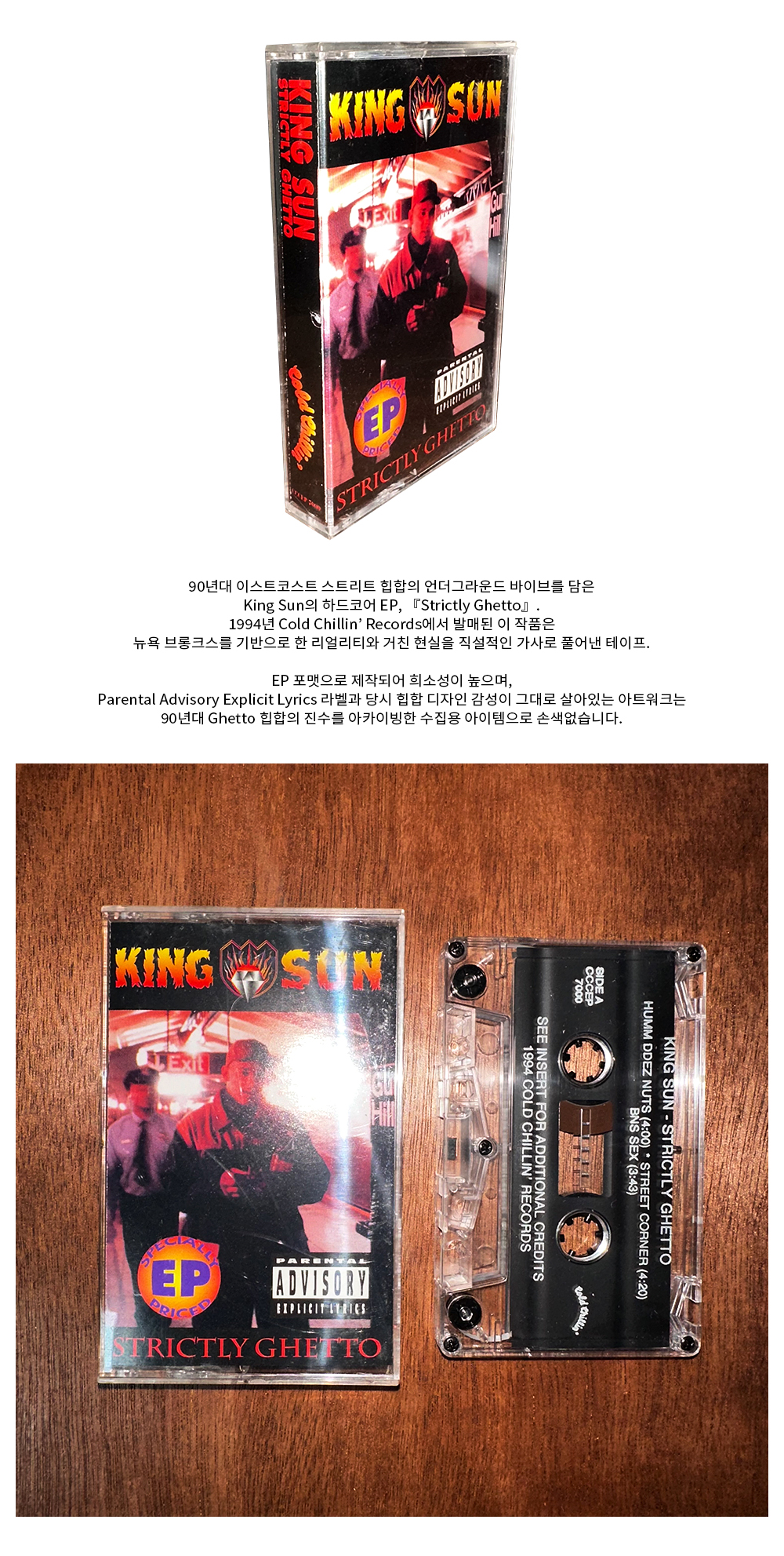 90년대 이스트코스트 스트리트 힙합의 언더그라운드 바이브를 담은 King Sun의 하드코어 EP, 『Strictly Ghetto』. 1994년 Cold Chillin’ Records에서 발매된 이 작품은 뉴욕 브롱크스를 기반으로 한 리얼리티와 거친 현실을 직설적인 가사로 풀어낸 테이프. EP 포맷으로 제작되어 희소성이 높으며, Parental Advisory Explicit Lyrics 라벨과 당시 힙합 디자인 감성이 그대로 살아있는 아트워크는 90년대 Ghetto 힙합의 진수를 아카이빙한 수집용 아이템으로 손색없습니다.